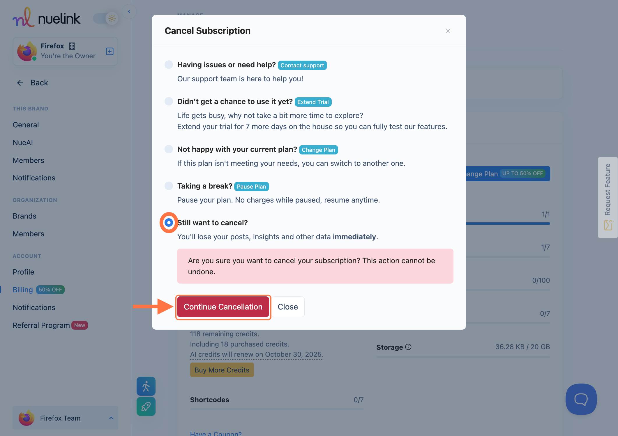 - If you want to cancel your account, select this option and click on Continue Cancelation: