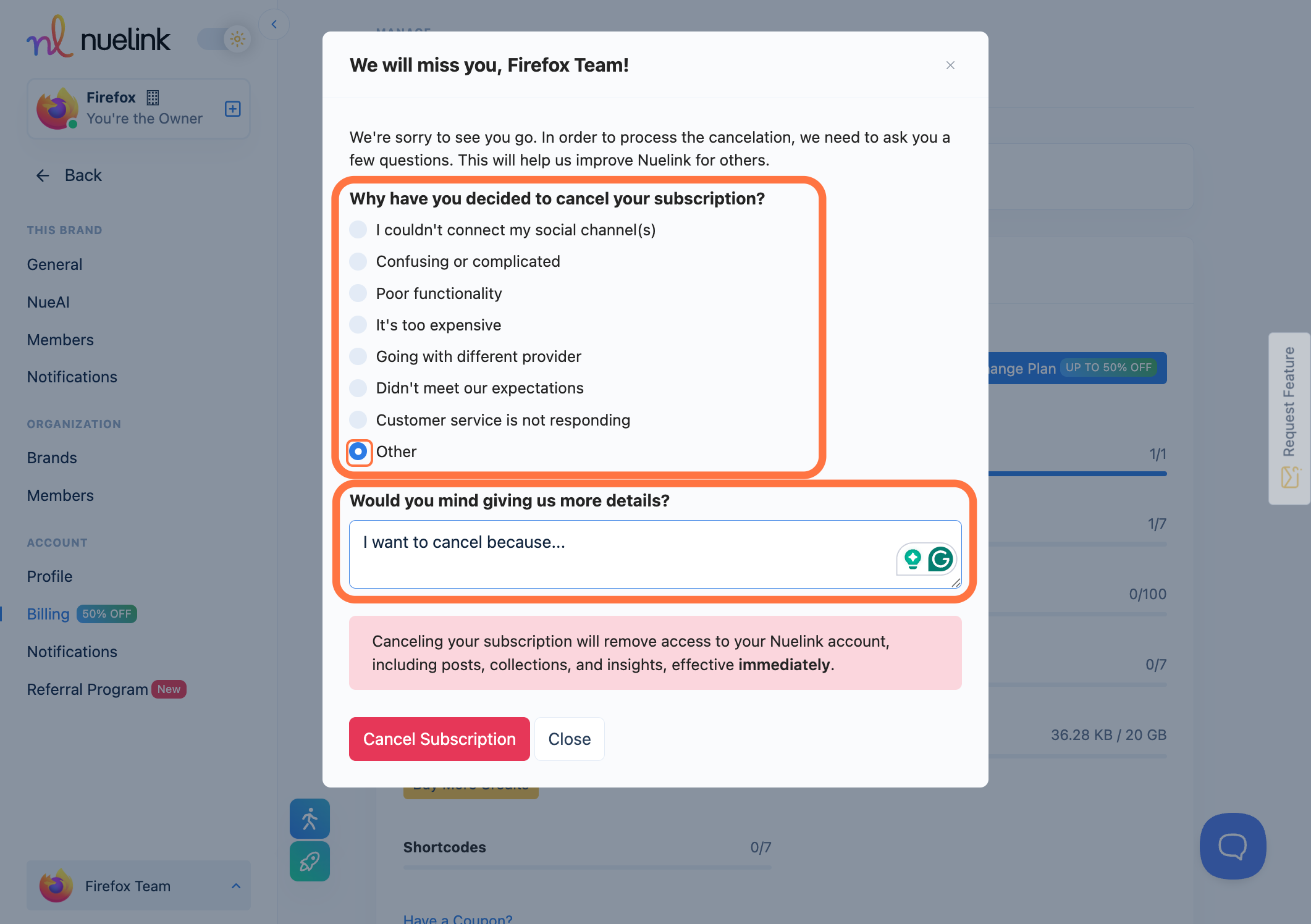Once you cancel your subscription, your access to your Nuelink account, including your posts, collections, and insights, will be lost.
