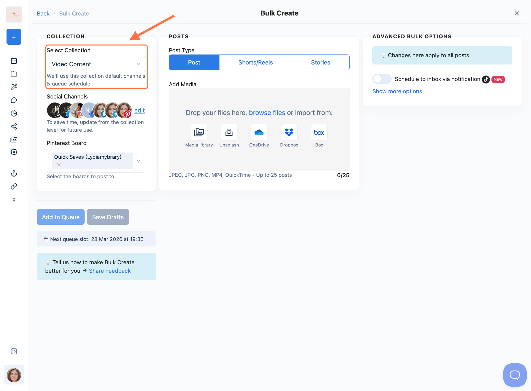 Select the collection where your posts will be added. Your posts will be scheduled based on this collection's posting times. Learn more about collections and how you can create them here.