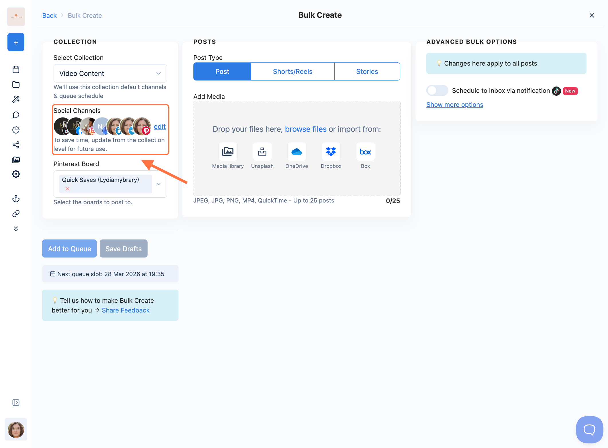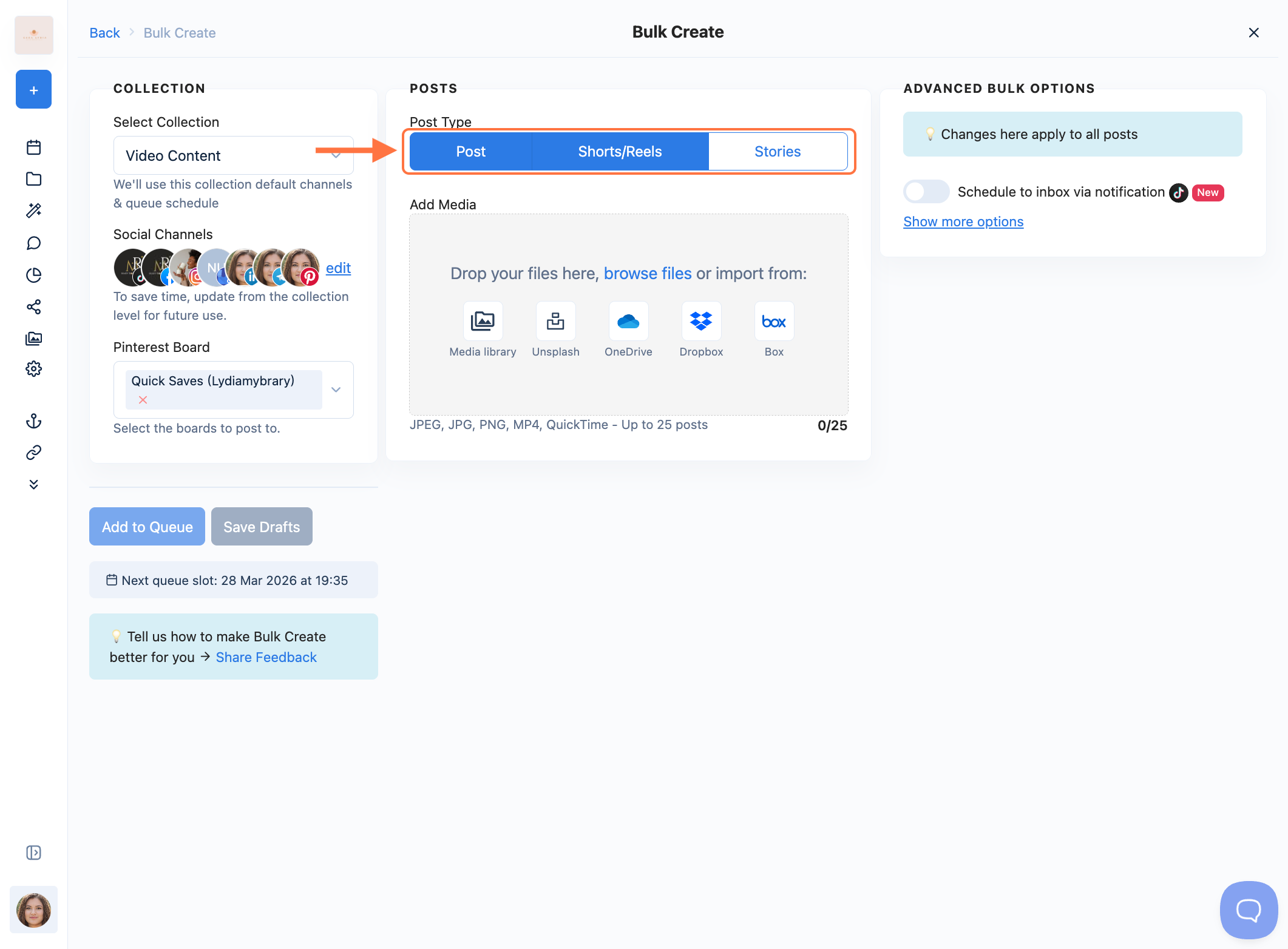 Note ⚠️: Make sure the content type is supported by the social platforms linked to the collection.
