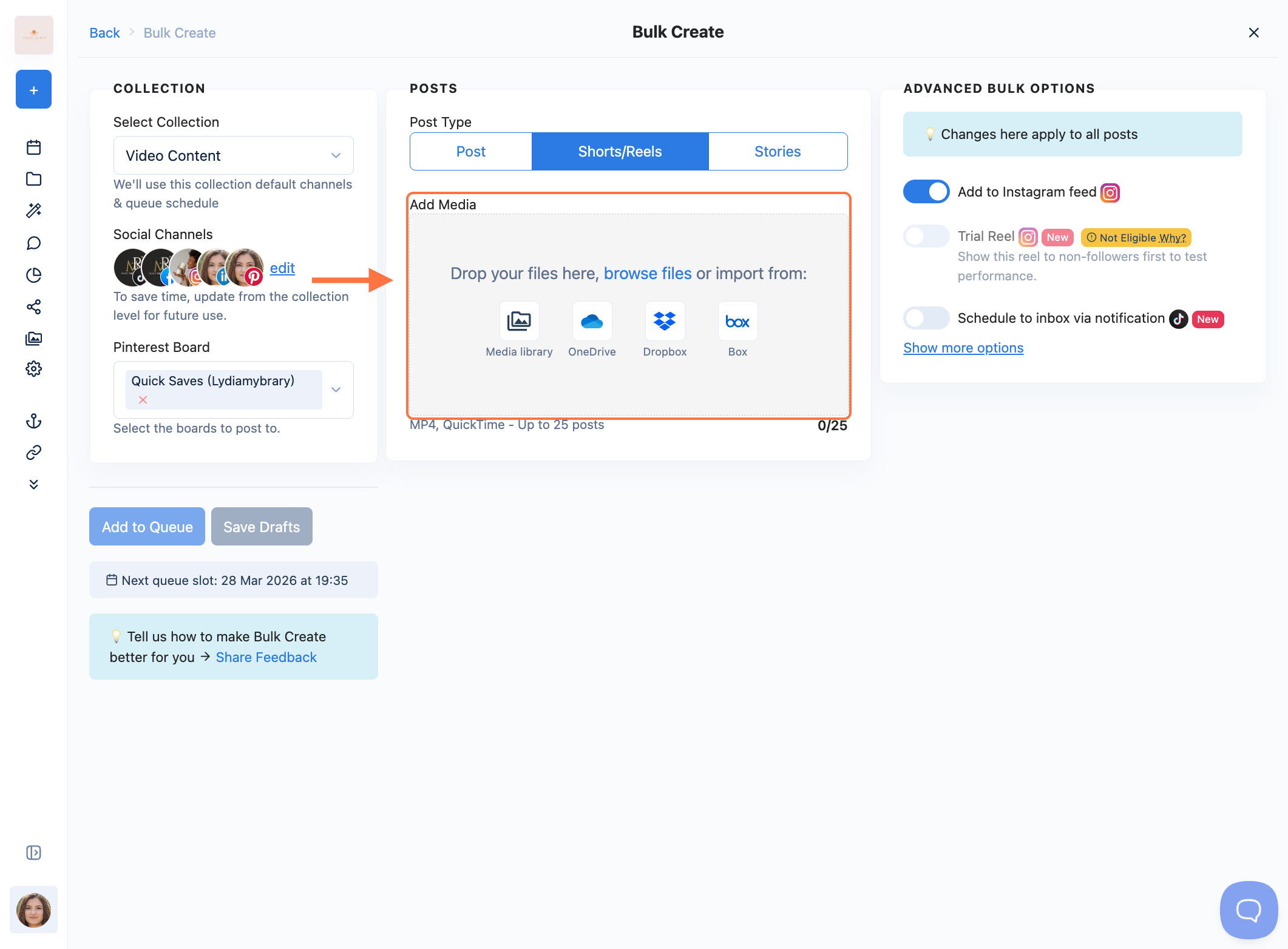 Nuelink's Bulk Create feature helps you save time by allowing you to create up to 25 posts at once! Whether you're scheduling image posts, Shorts, or Stories, this tool helps you stay consistent across all your platforms in just a few clicks.