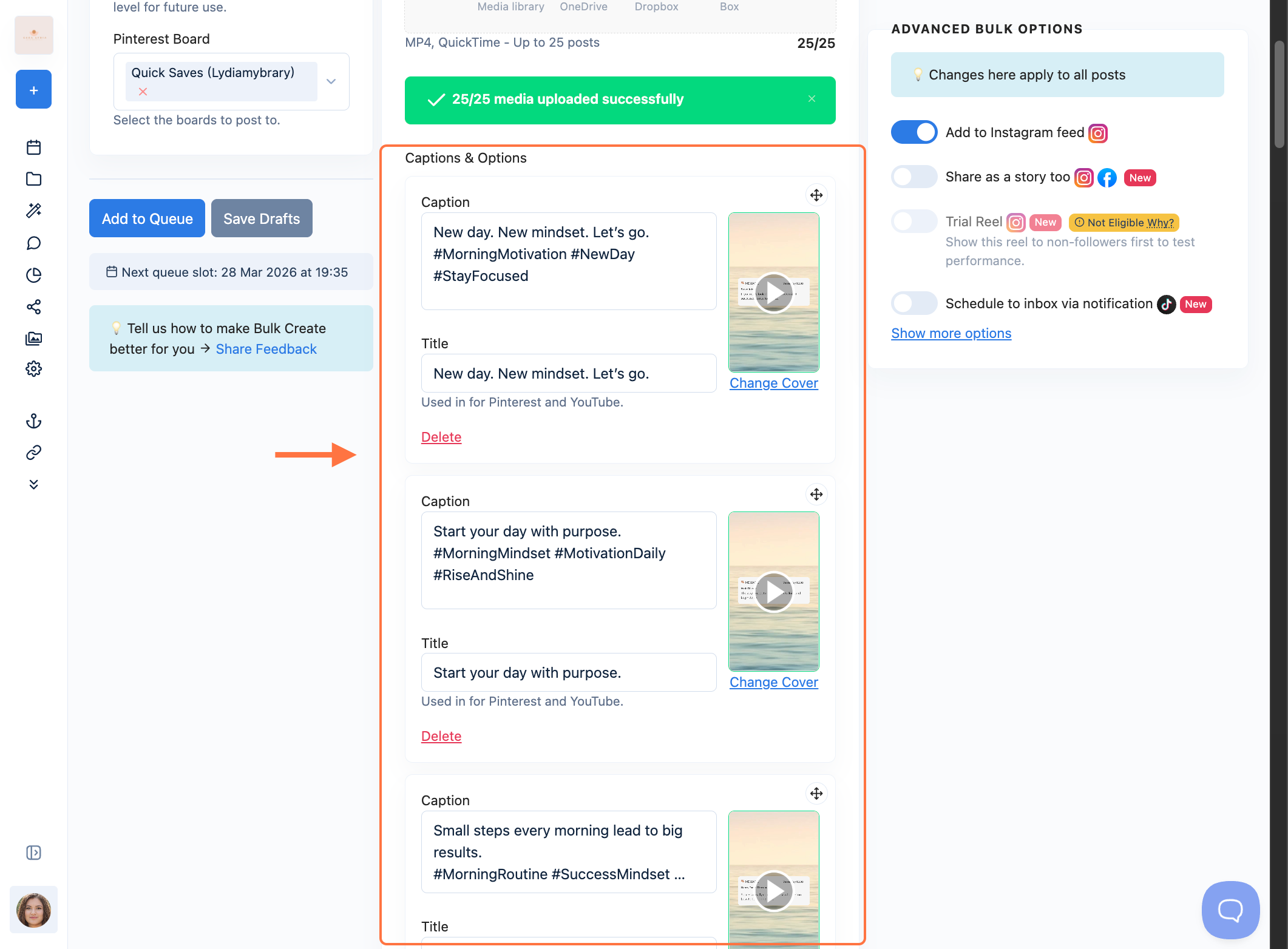 Bulk Create lets you upload multiple media files and generate posts in one go. You can add captions to each post manually or use Nuelink’s AI to generate engaging captions for you. This feature supports:
