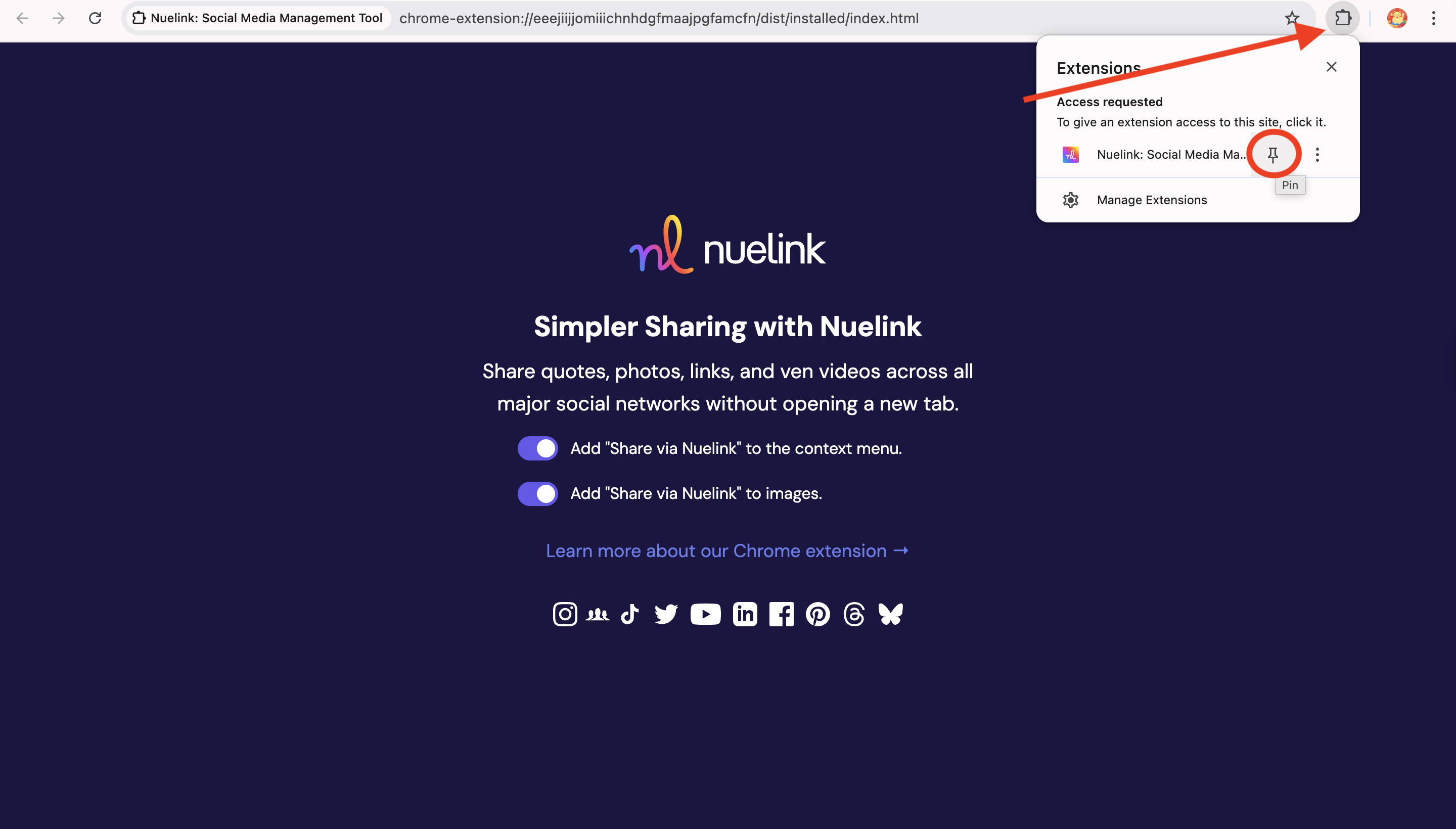 - Once installed, click on the puzzle at the top right, and pin Nuelink for quick access: