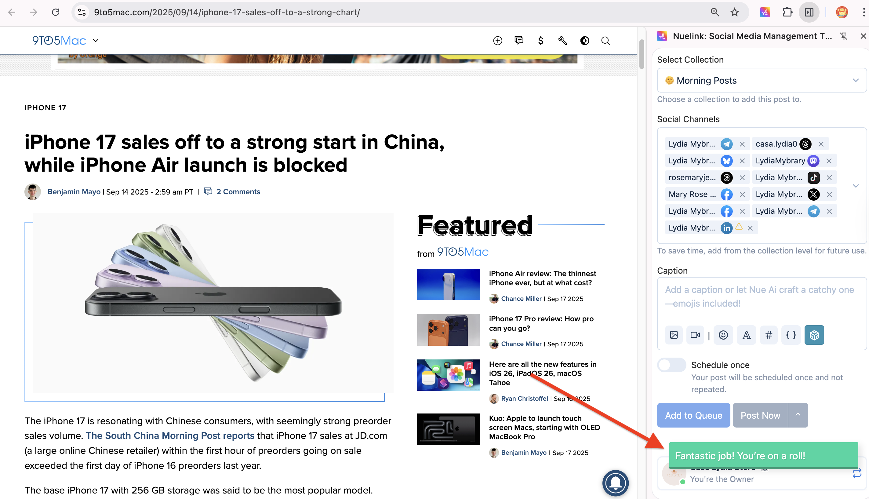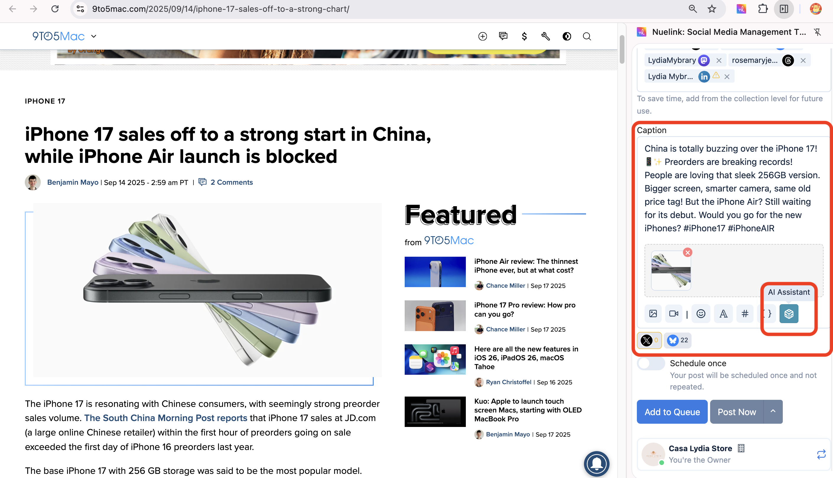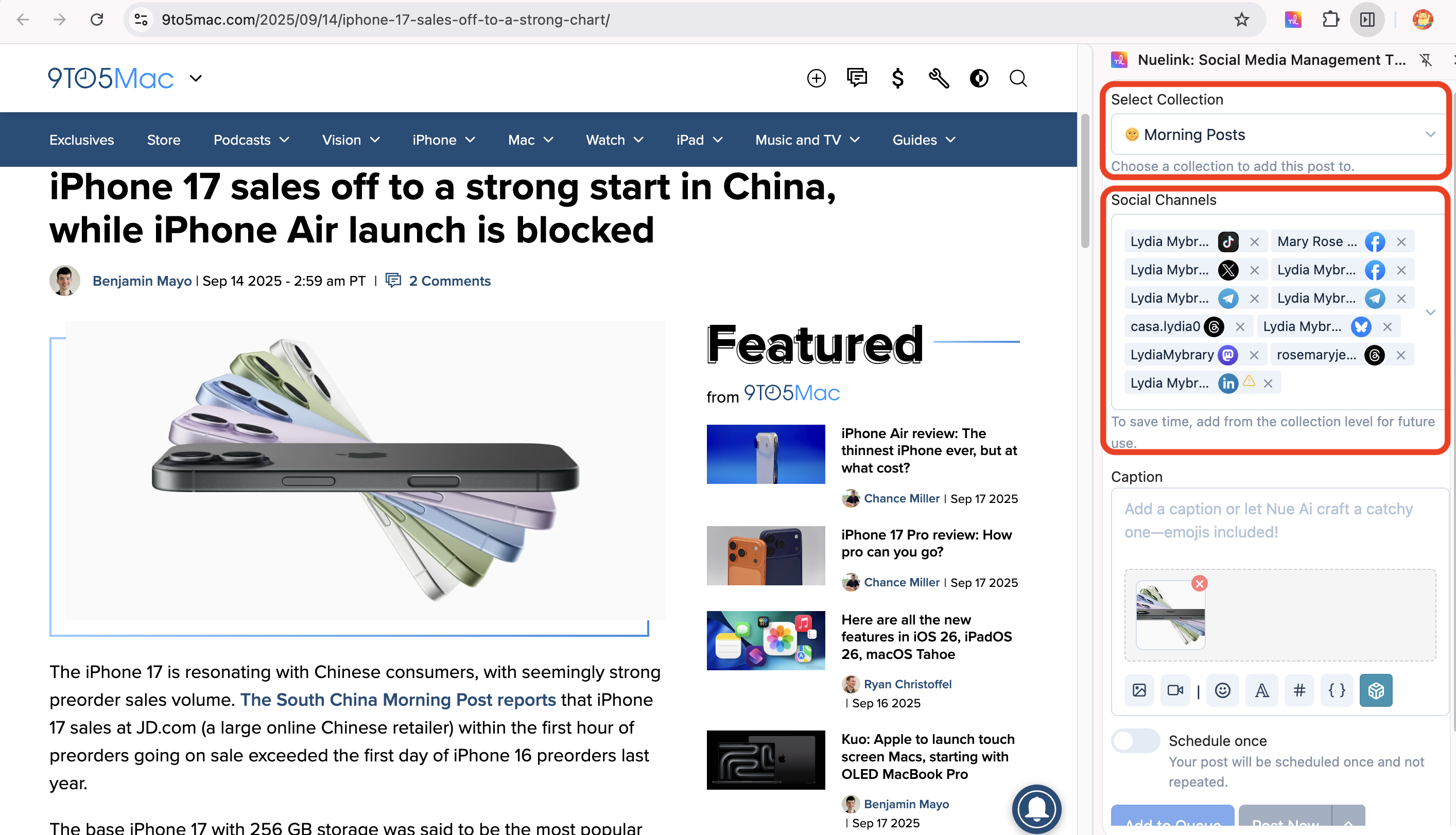The Nuelink Chrome Extension lets you create and share posts on all your linked social media accounts without opening a new tab or leaving your current page. It’s quick, easy, and designed for efficiency.