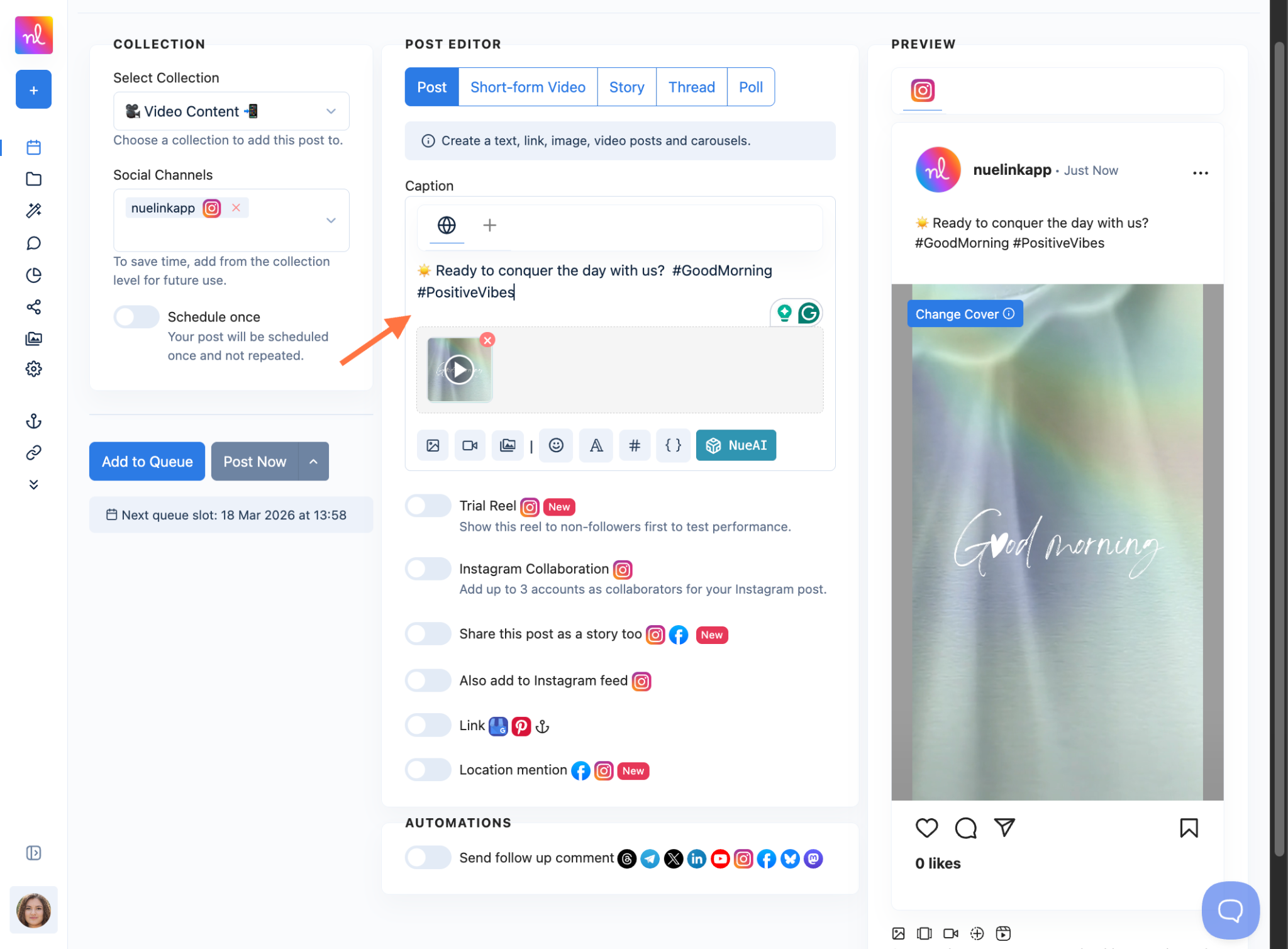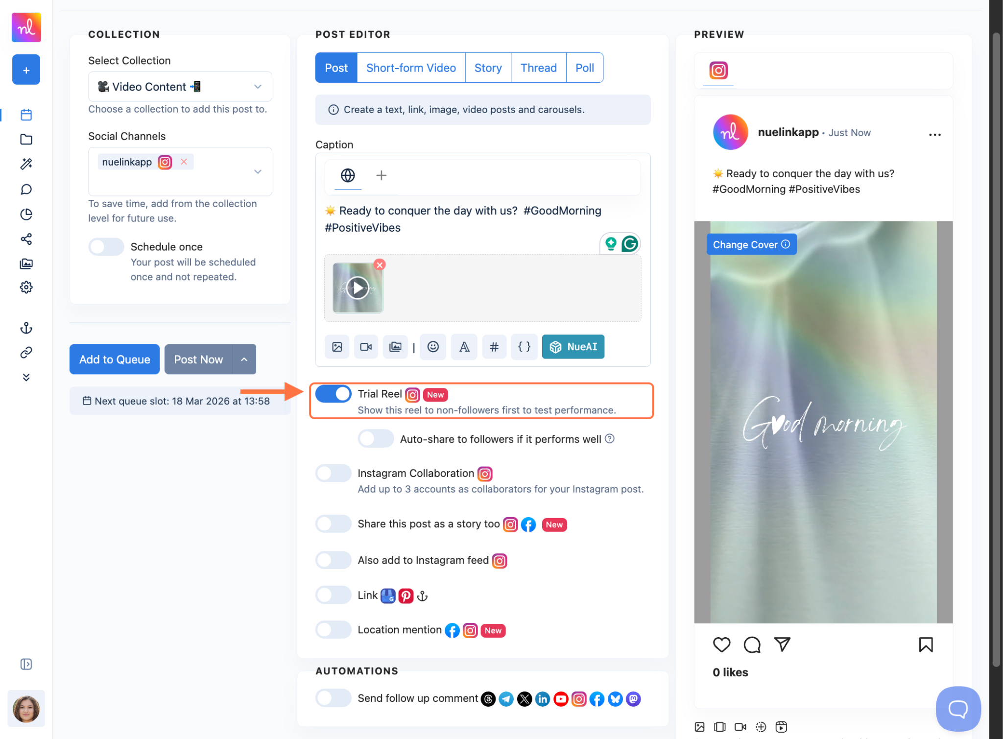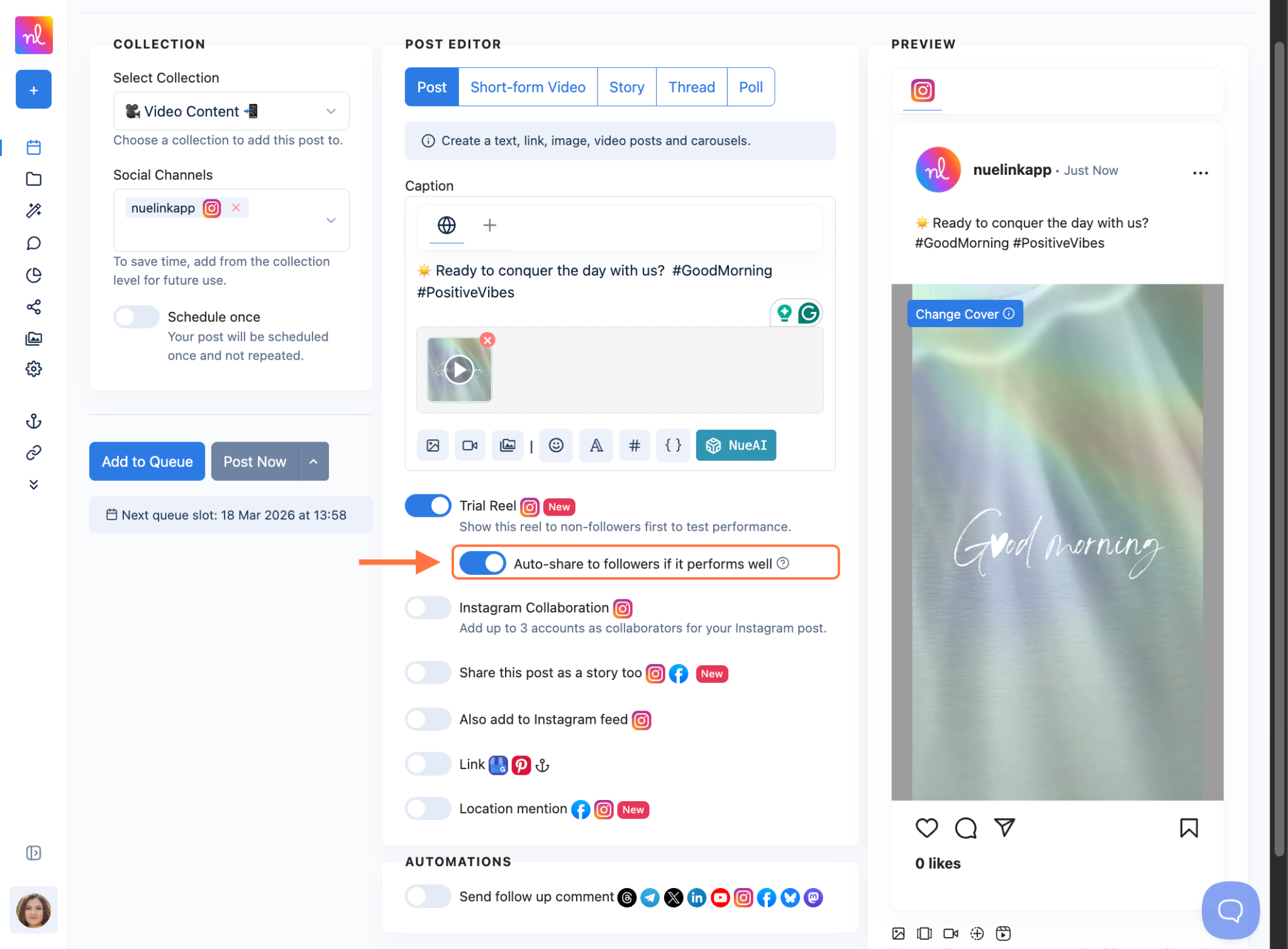 You can schedule your Instagram Trial Reels directly from Nuelink, plus an option to auto-share to followers if the reels perform well. Make sure you have your Instagram Account connected beforehand.