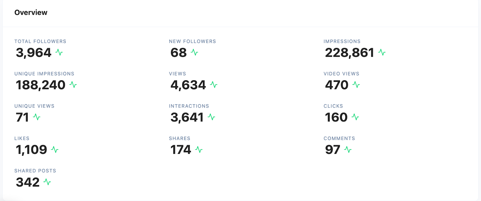 The metrics generally contain: followers(total+new), impressions(all+ unique), views(video, total, unique), Interactions(total, clicks, likes, shares, comments, shared posts… and other metrics depending on the platform selected.