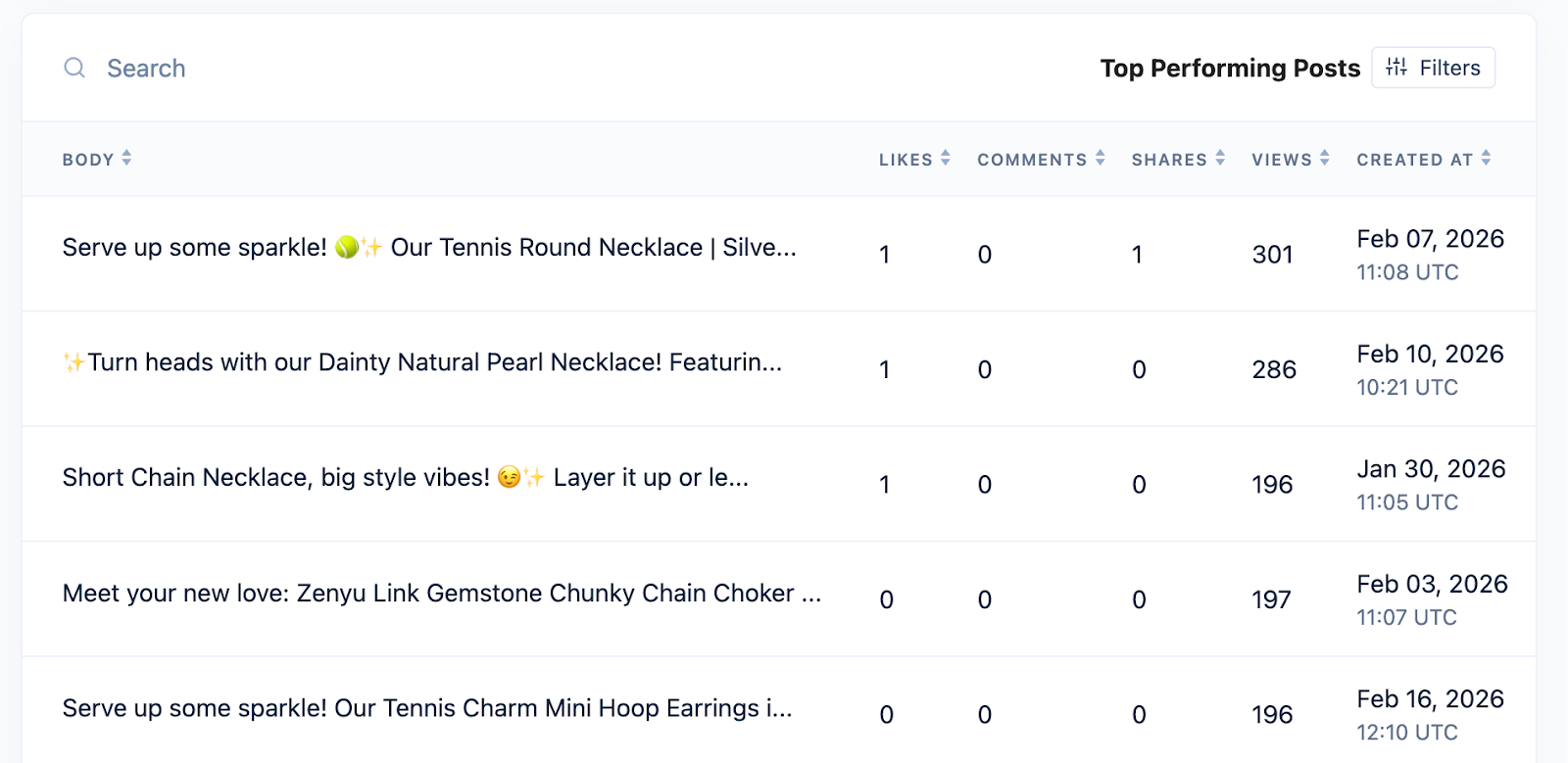 To see your top-performing posts, first select a specific channel from the dashboard. Once a platform is selected, you will see a list of the most recent top posts for that account. These posts can be filtered by metrics such as likes, comments, shares, views, and the date they were created.
