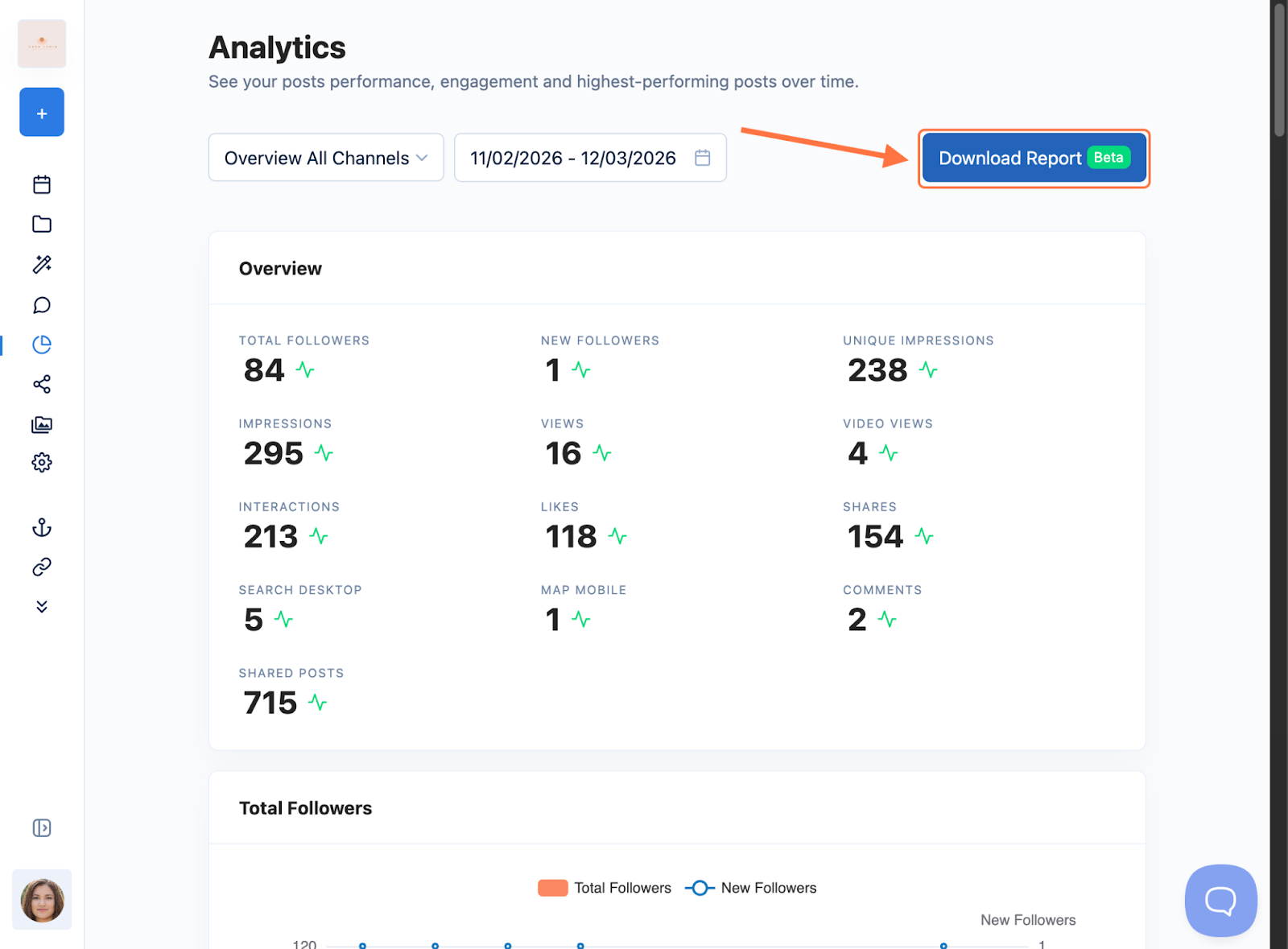 The followers metric helps you track audience growth across your connected platforms.