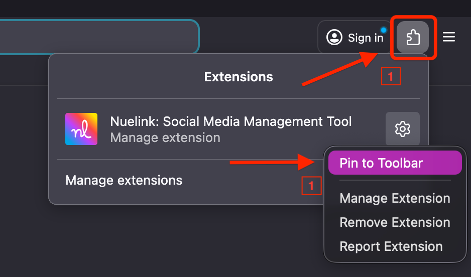 Click the puzzle icon in the top-right corner and pin the Nuelink extension by clicking the icon.