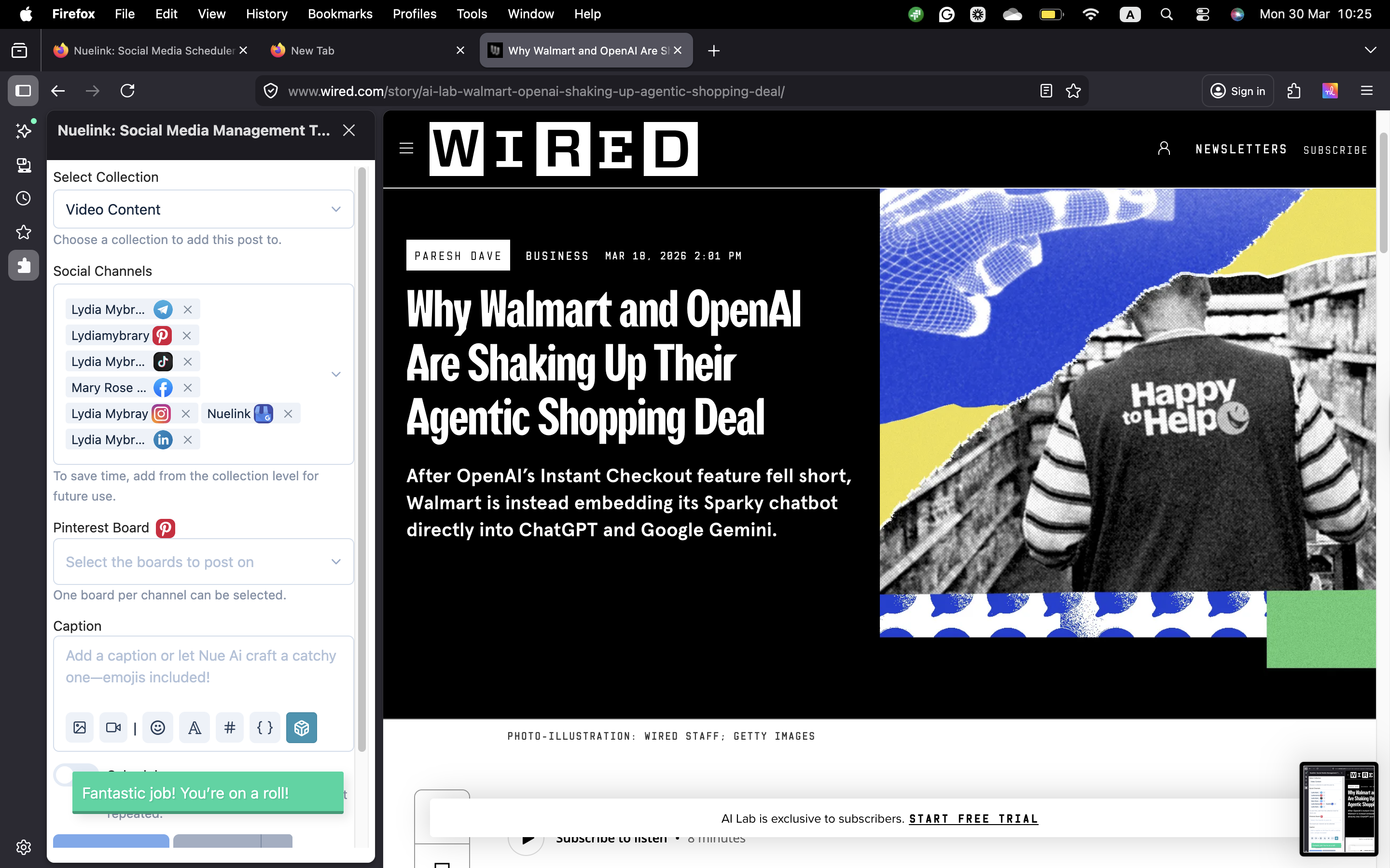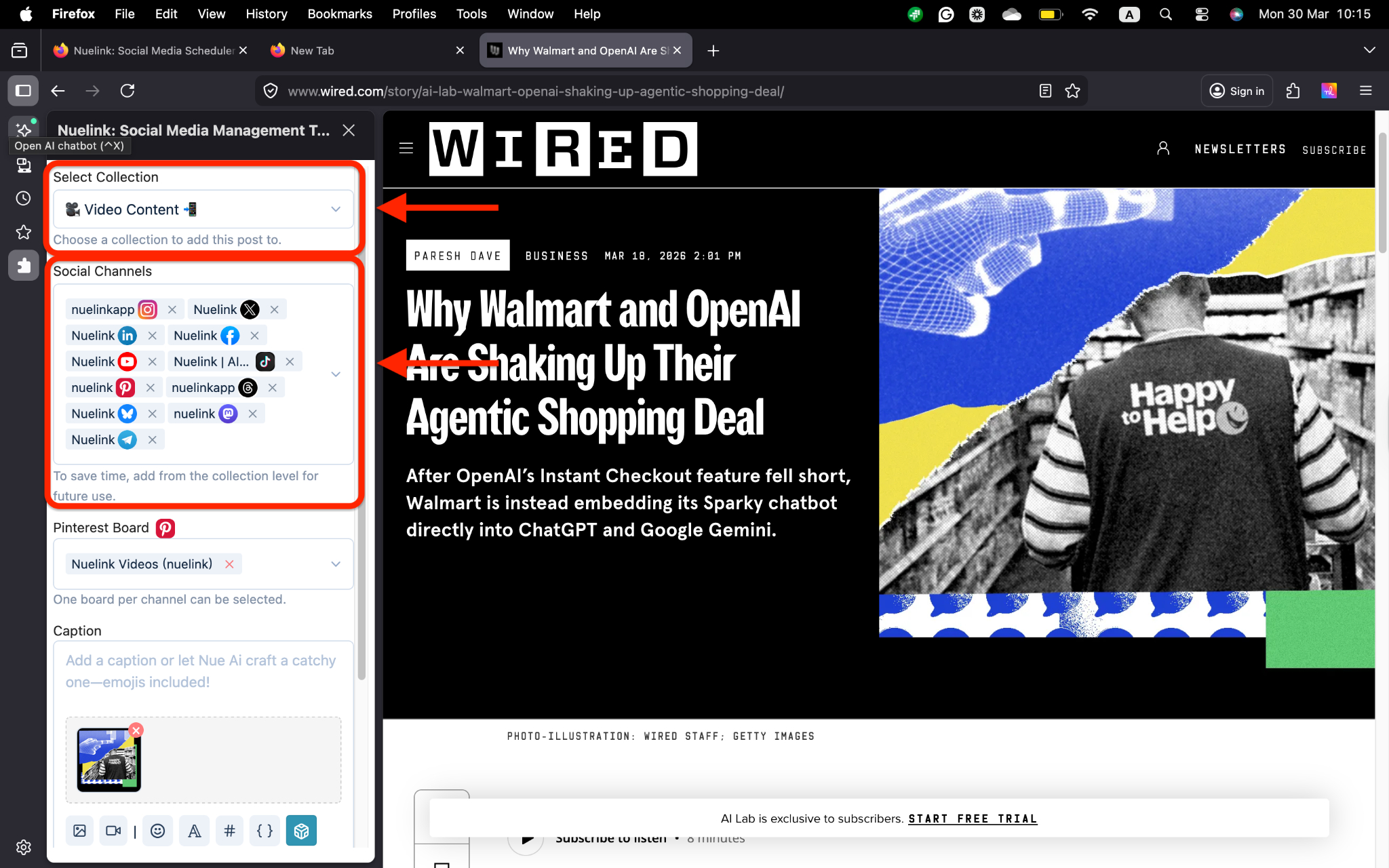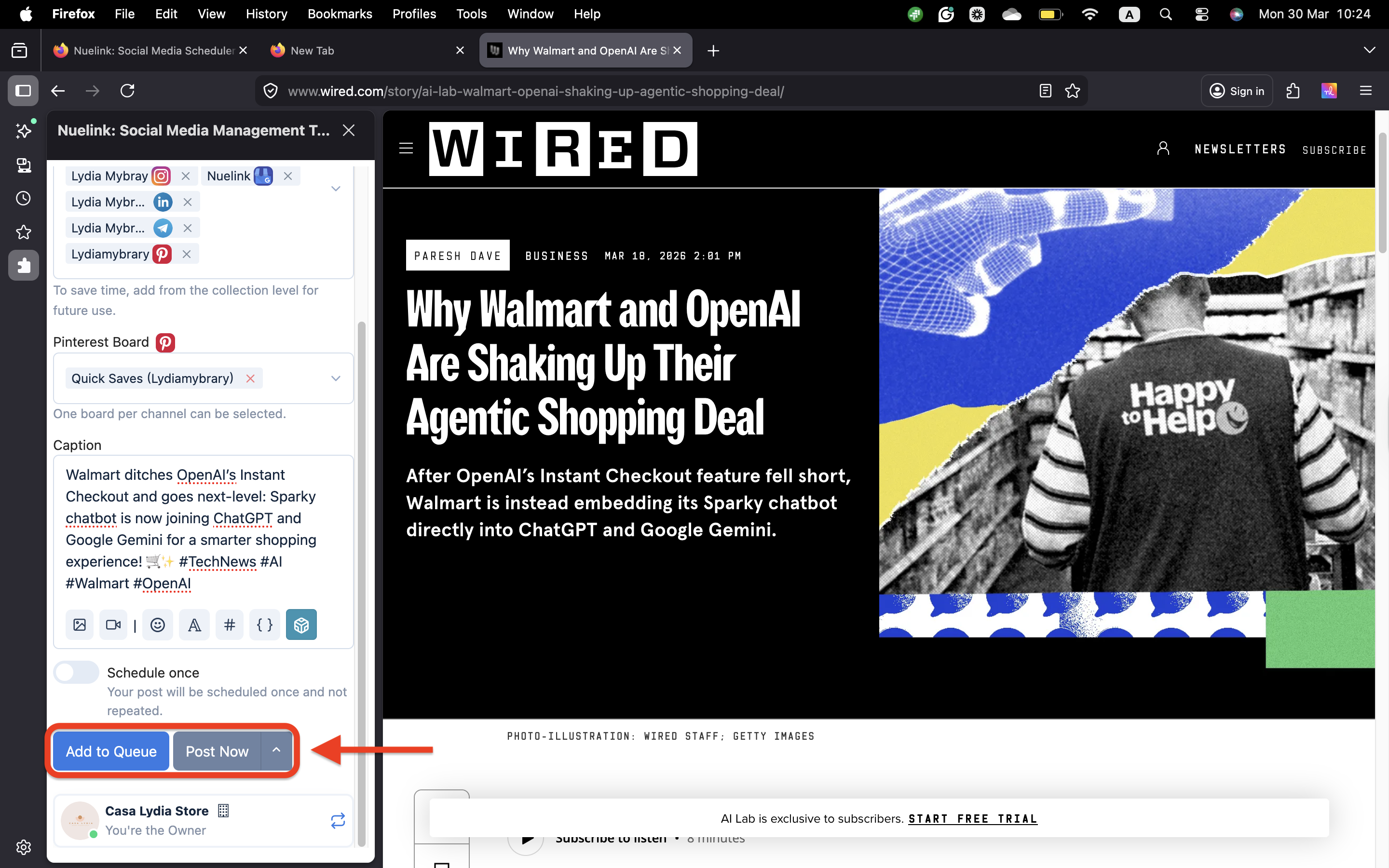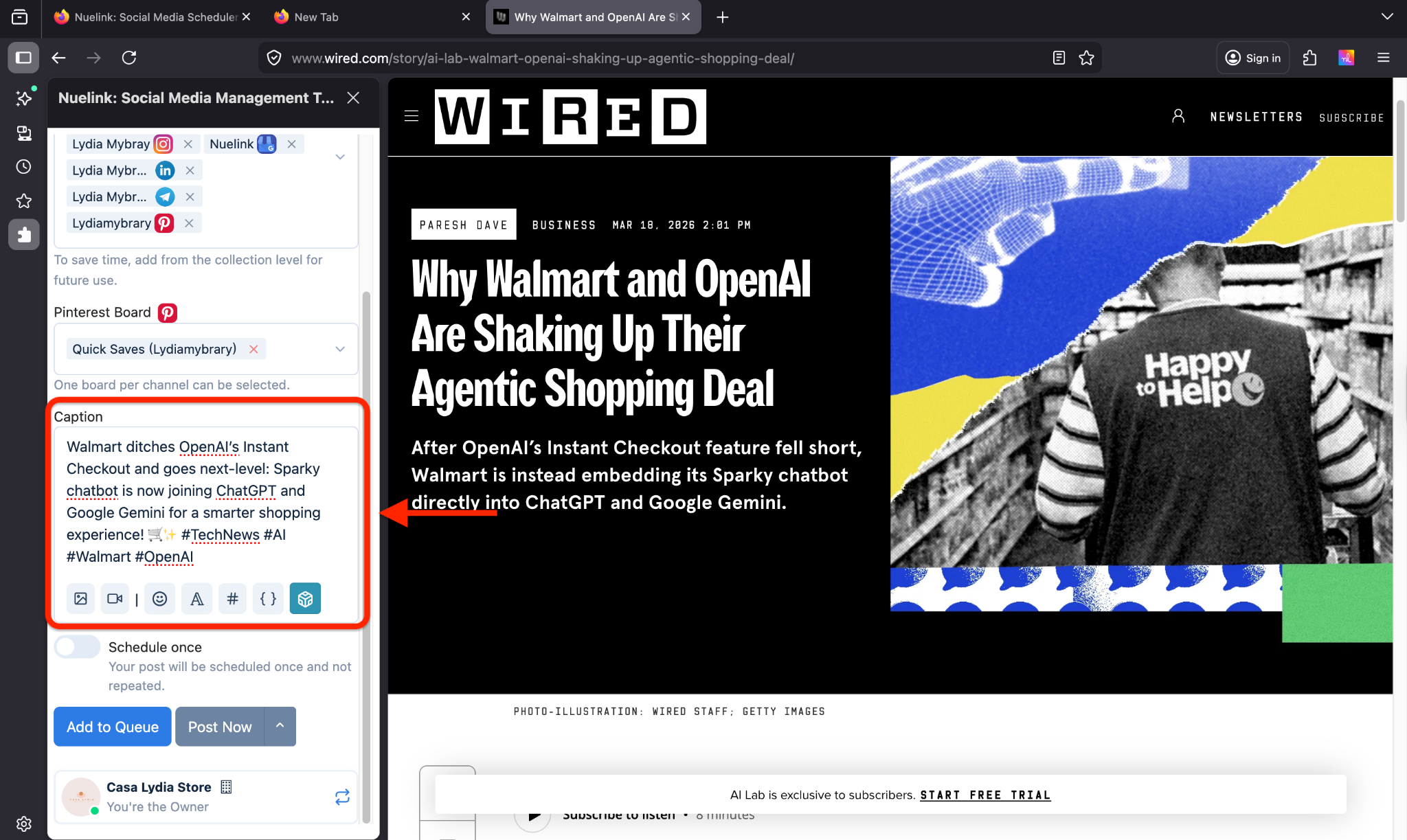 The Nuelink Firefox Extension lets you create and share posts on all your linked social media accounts without opening a new tab or leaving your current page. It’s quick, easy, and designed for efficiency.