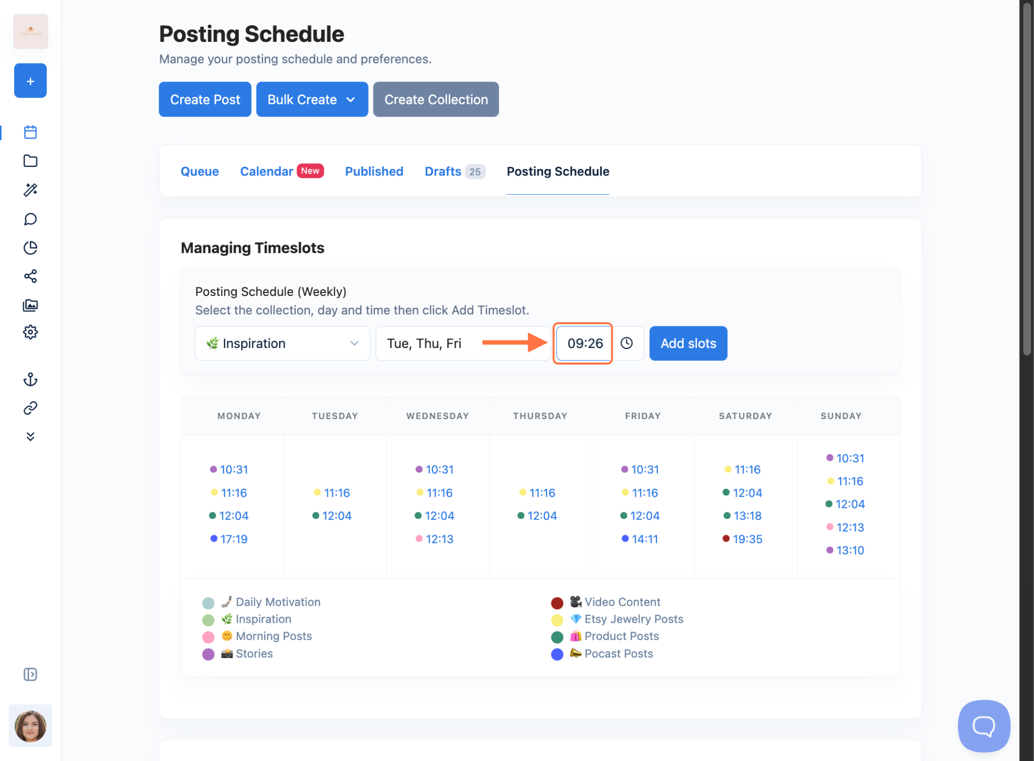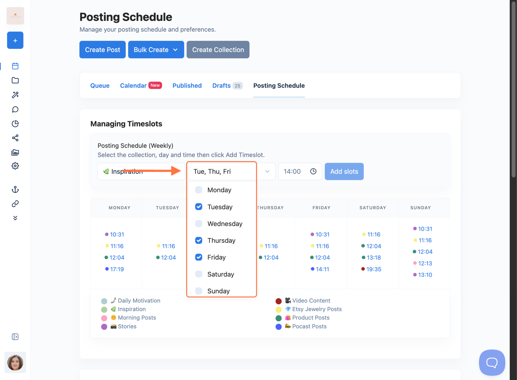 You will immediately see the new timeslot appear on your weekly calendar view below. The calendar is color-coded by collection, making it easy to visualize your content distribution at a glance. You can repeat this process to add as many time slots as you need for each collection.