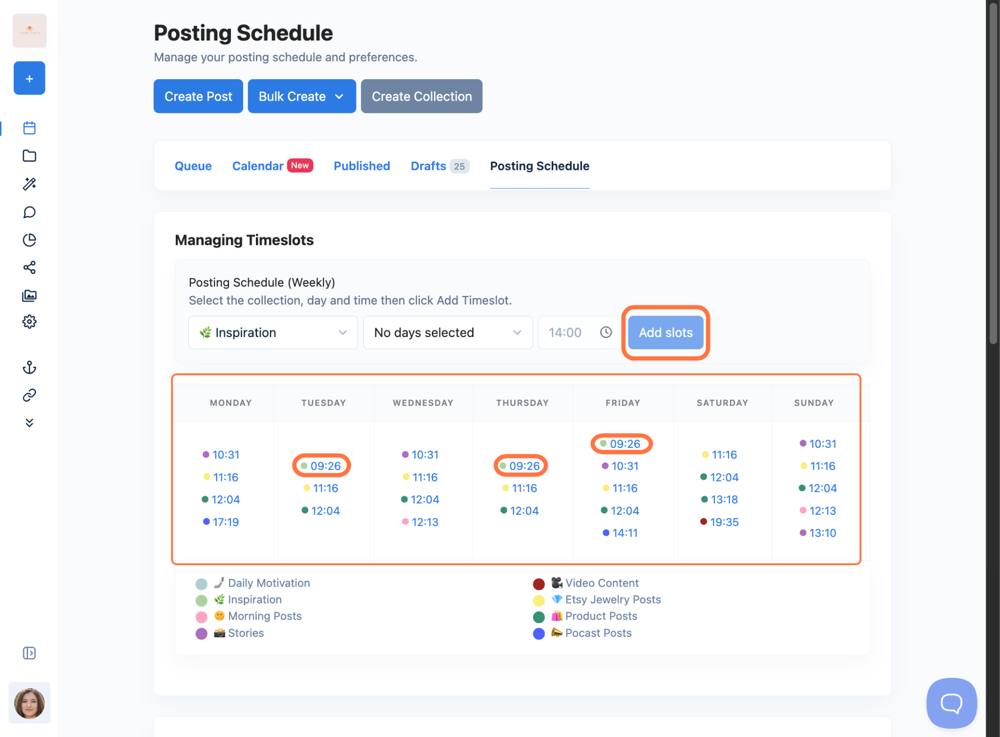 Beyond setting timeslots and timezones, the Posting Schedule page offers a few extra tools to help you manage your content flow: