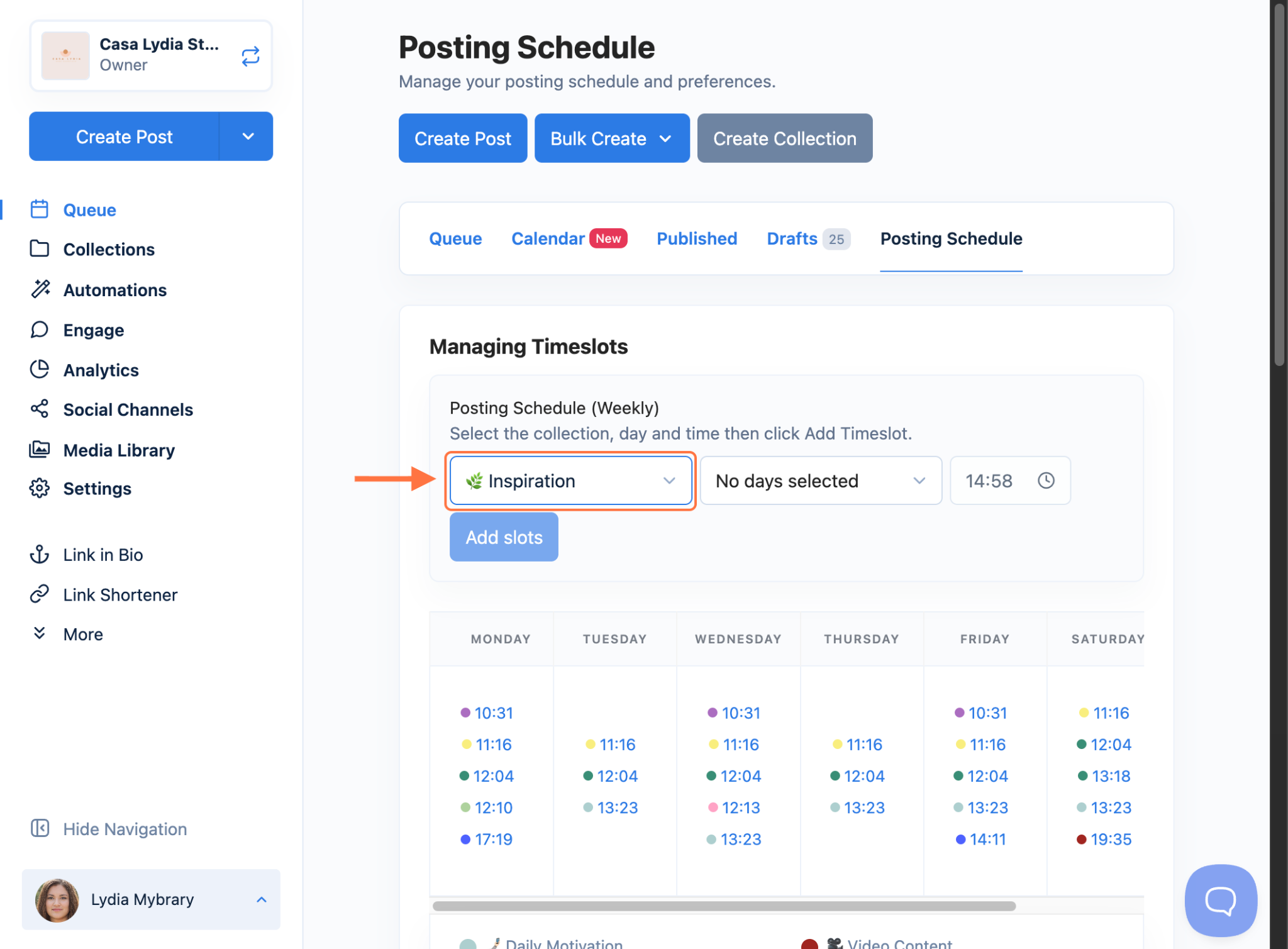 - In the Managing Timeslots section, you will see a dropdown menu for your collections. Select the collection you want to schedule (e.g., "Our Blog" or "Weekly Polls").