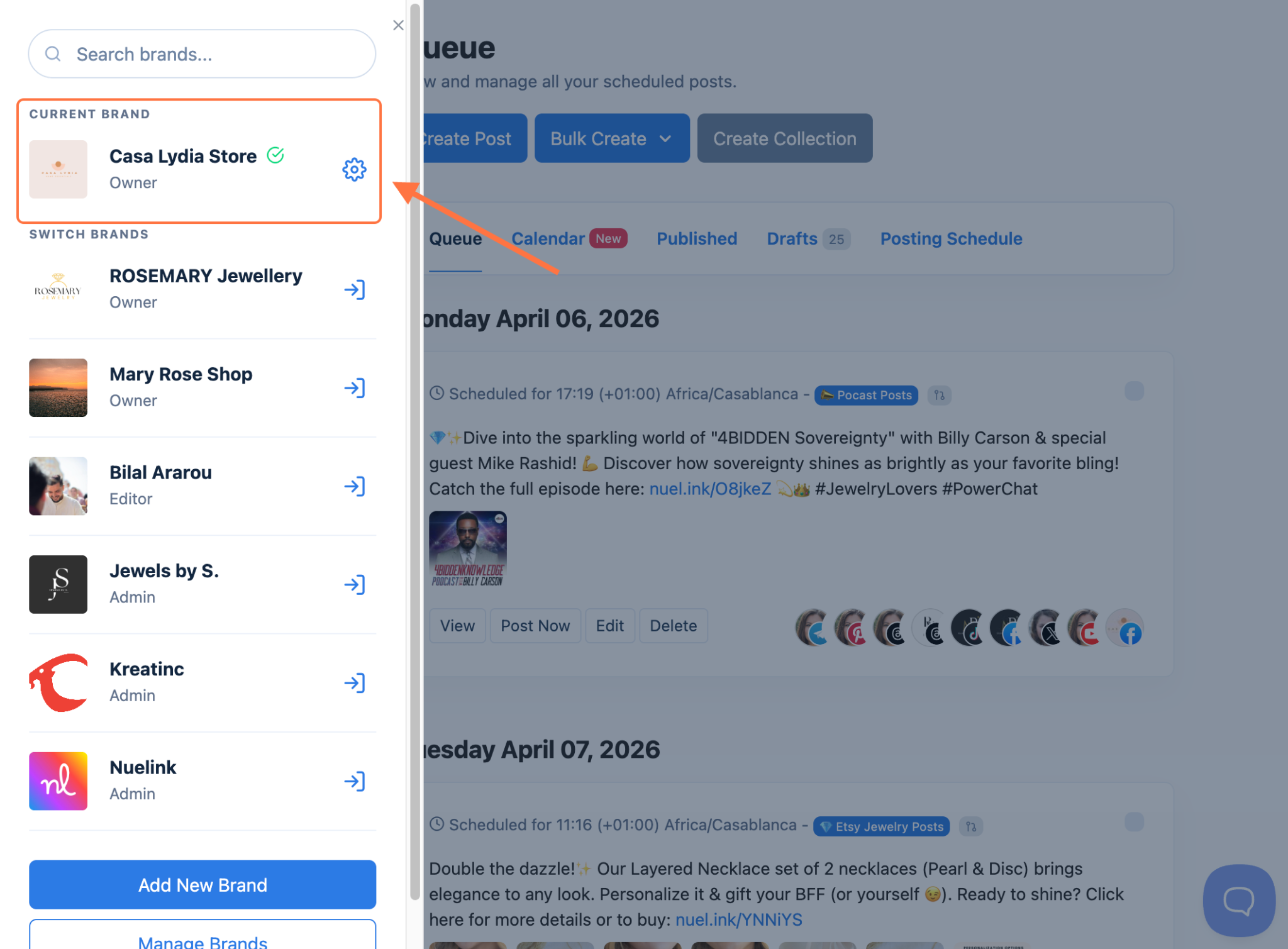 - Switch between brands easily: When you select a different brand from the dropdown menu in Nuelink, you automatically switch to that brand's queue and posting schedule.