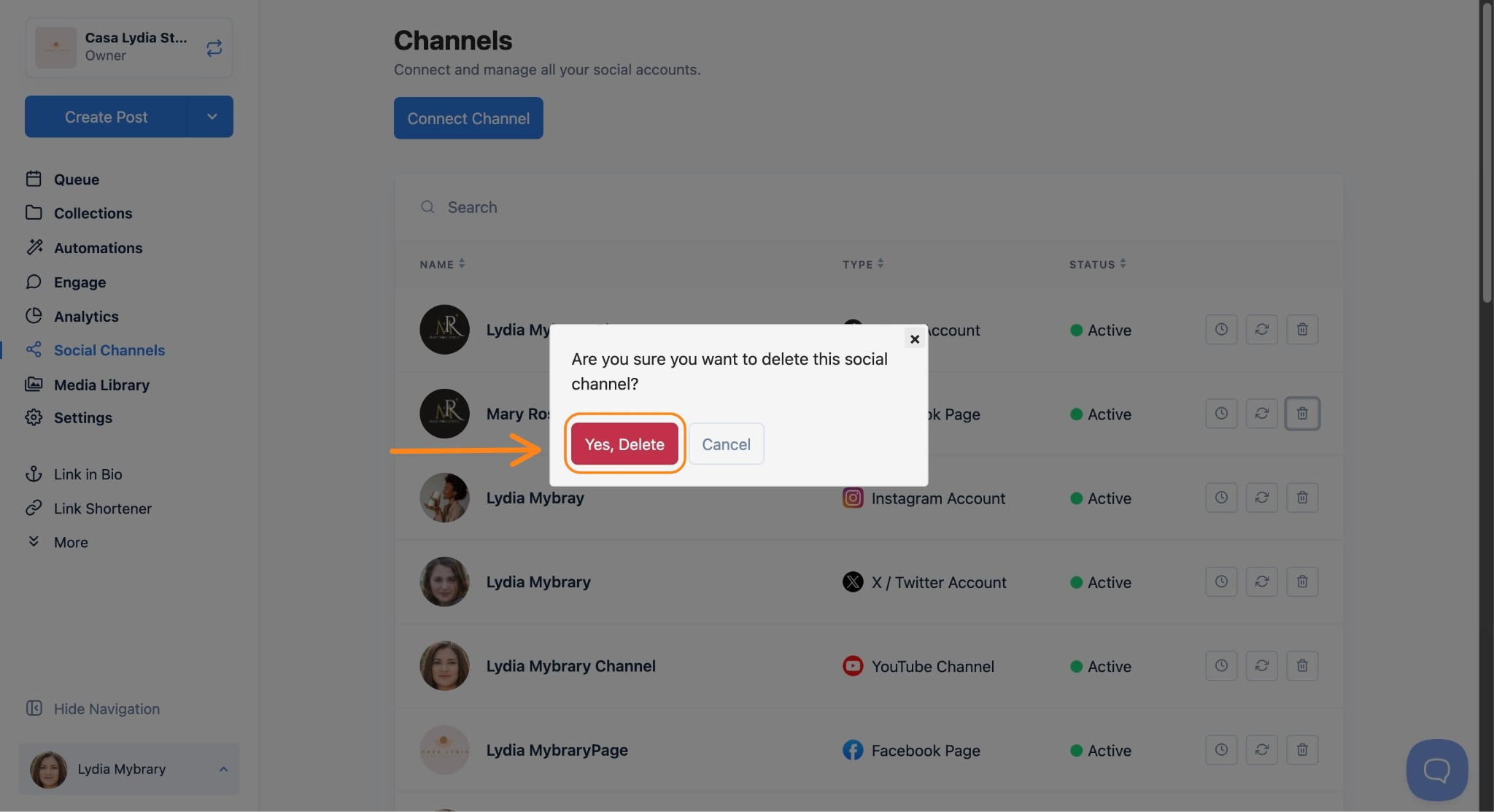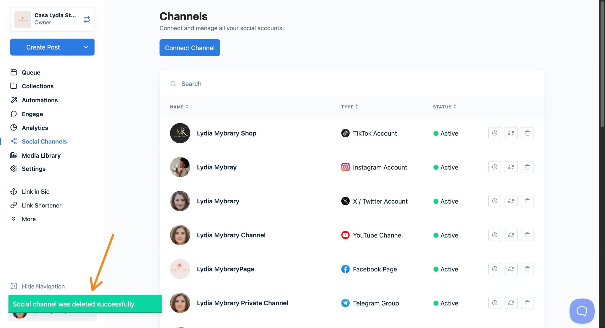 - The channel will be removed from your Channels list. Any posts that were scheduled for that channel will no longer be sent.