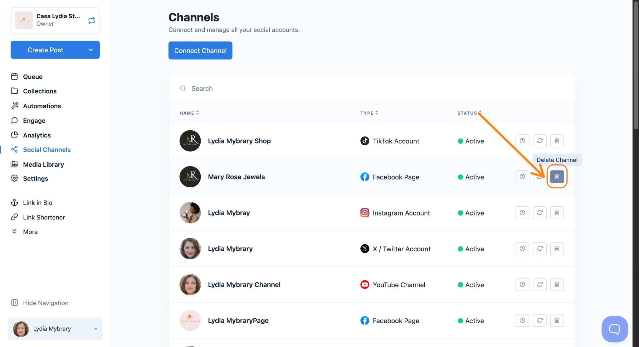 - Click the delete icon next to the channel you want to remove.