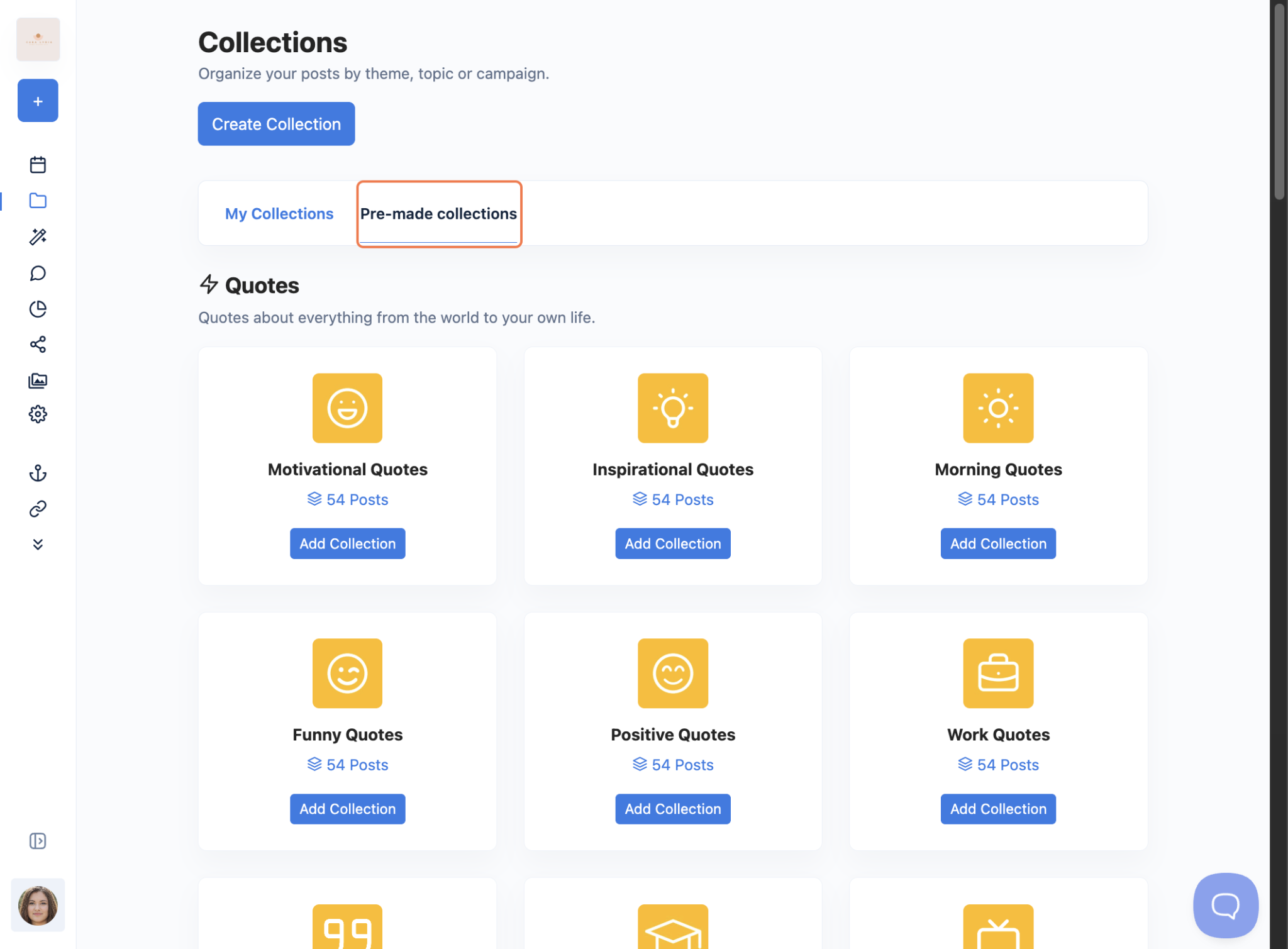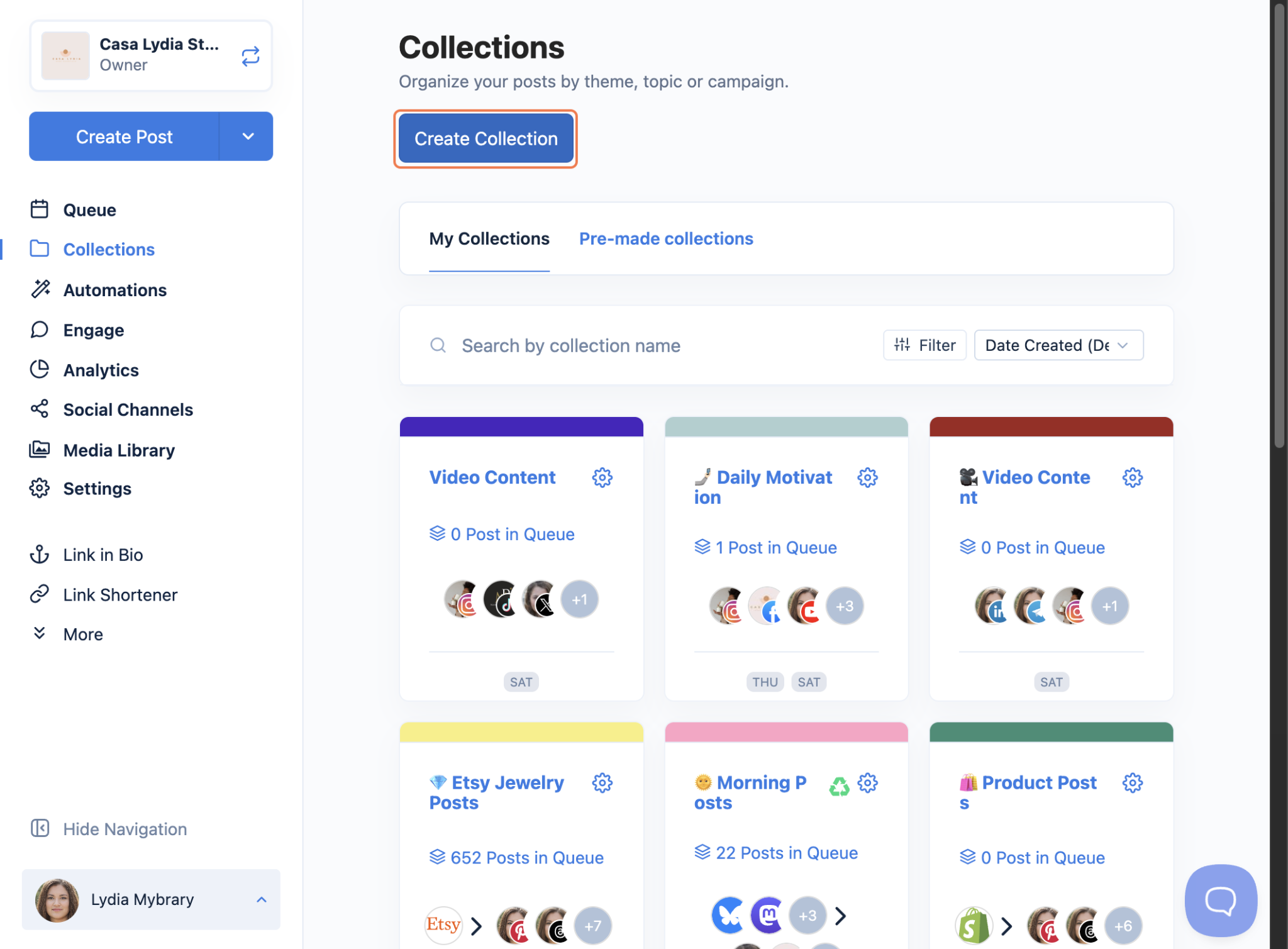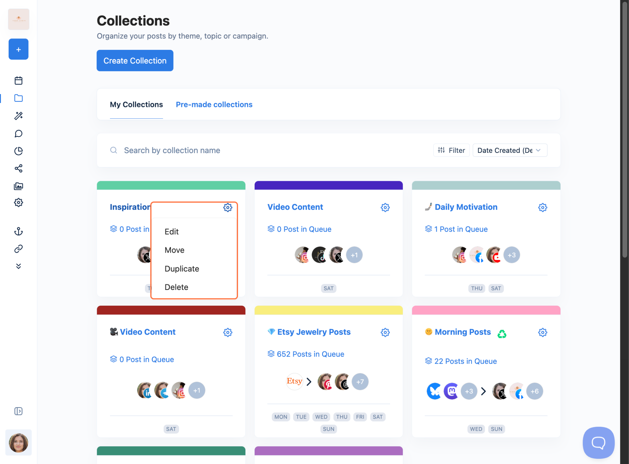 Collections are like separate folders for different types of social media content. Inside each collection, you can organize social media posts based on theme, category, or topic. Each Collection has its own social media channels and specific weekly posting times.