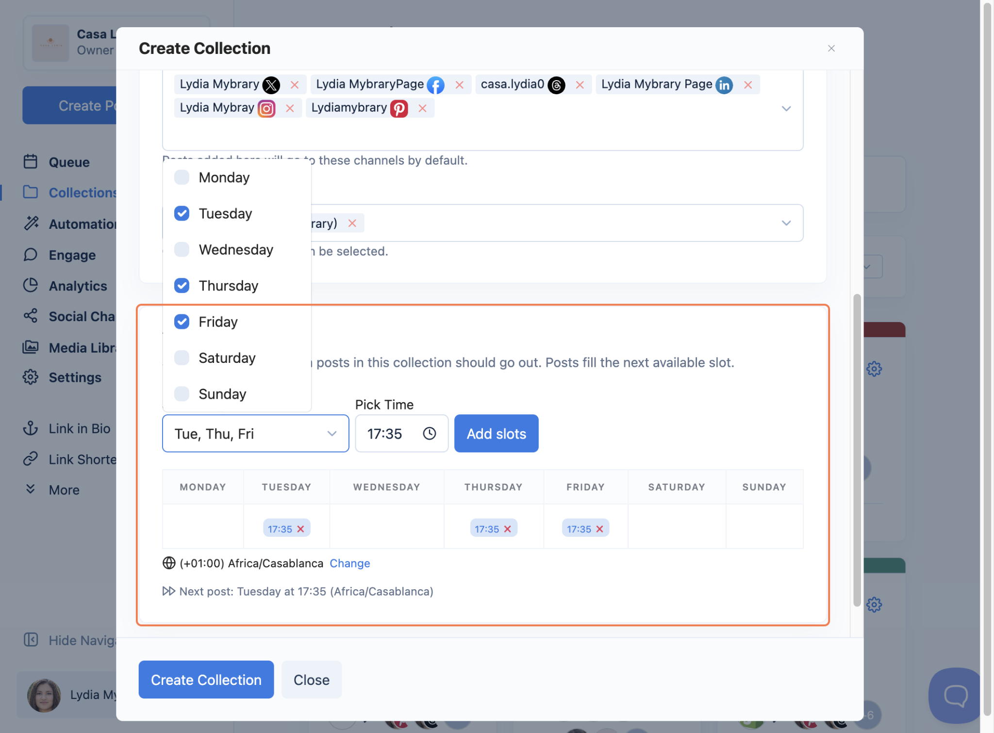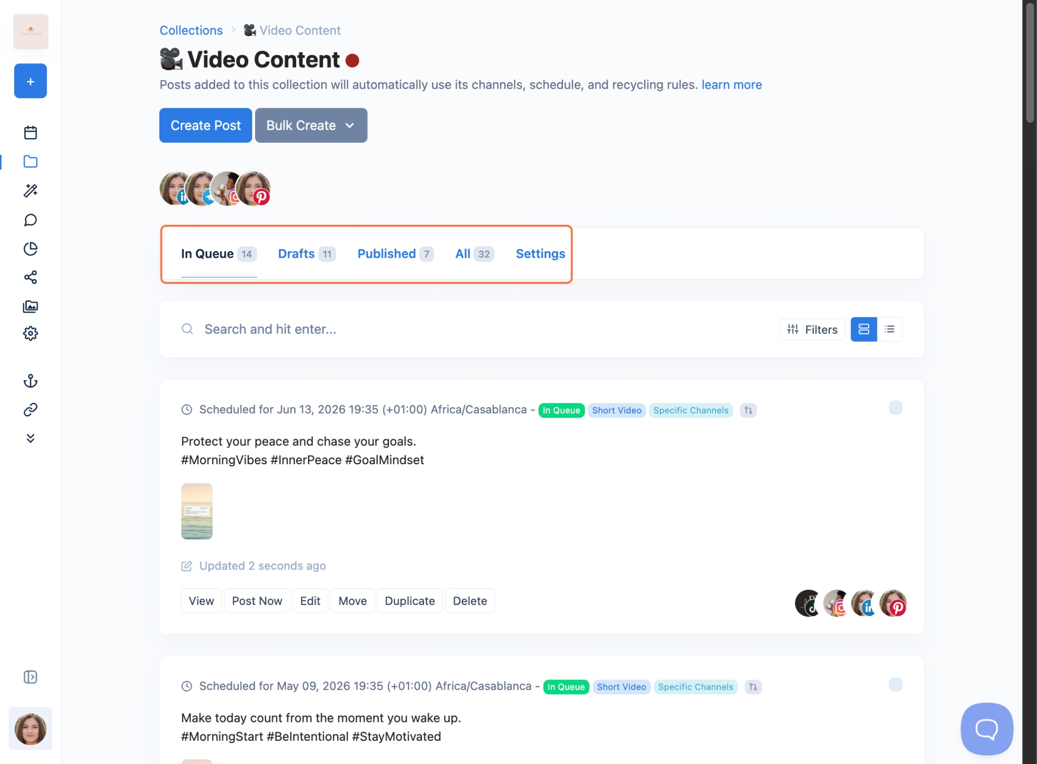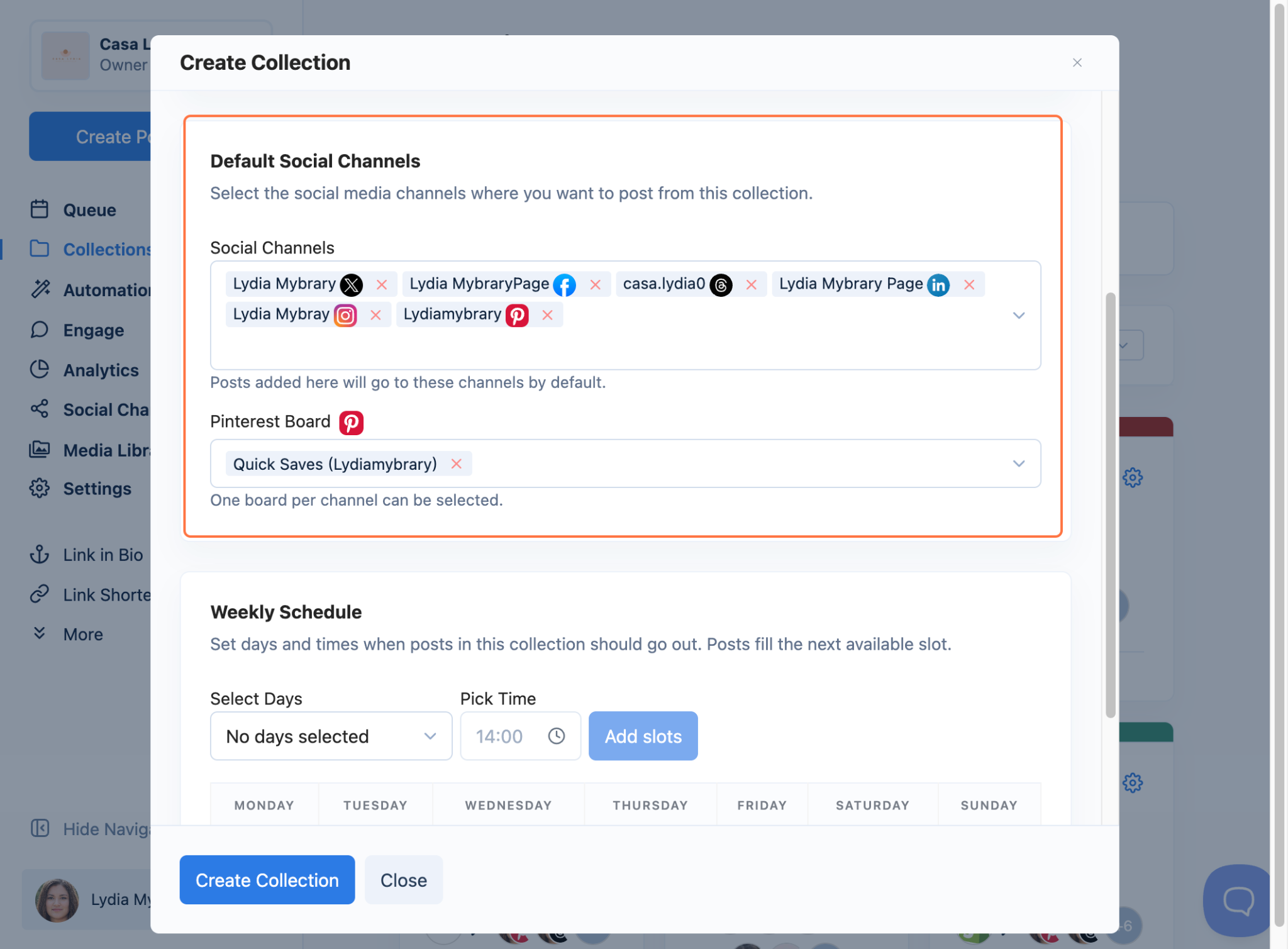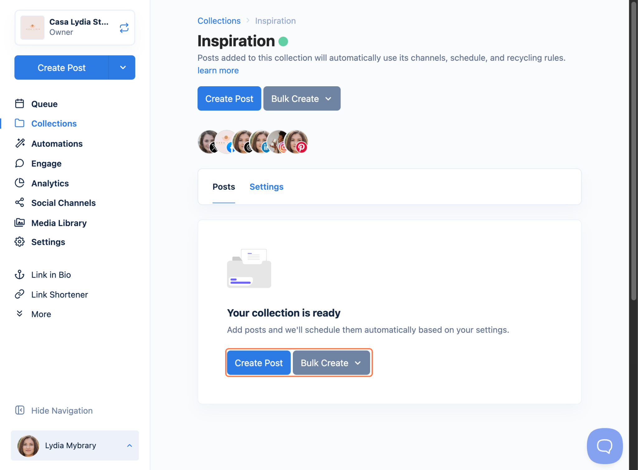 Collections are like separate folders for different types of social media content. Inside each collection, you can organize social media posts based on theme, category, or topic. Each Collection has its own social media channels and specific weekly posting times.