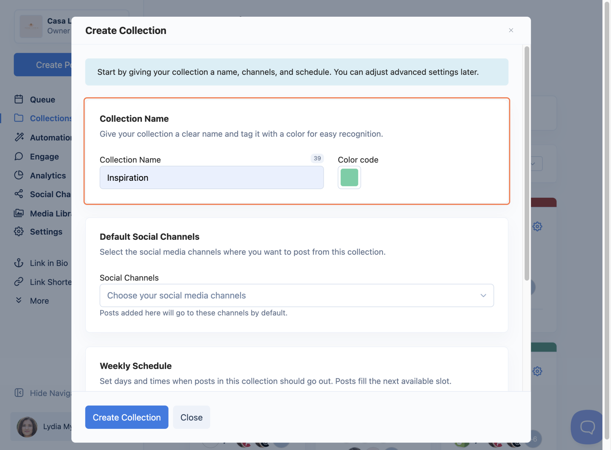 - Enter a Collection Name and pick a Color Code. Choose a name that describes the type of posts you'll include (for example: "Blog", "Products", or "Short-Form Recipes"). The color helps you spot this collection at a glance in the Queue.