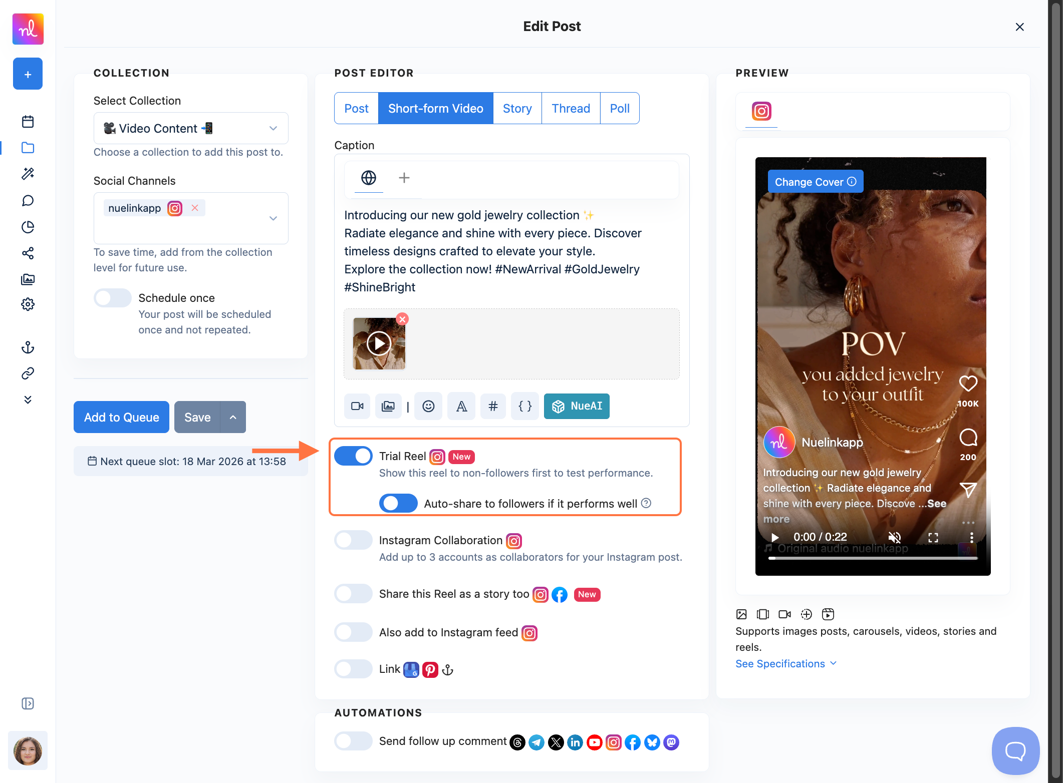 New 🆕: You can now schedule Instagram Trial reels via Nuelink, plus the option to automatically share with your followers if the reels perform well. This feature is available for accounts with at least 200 followers.