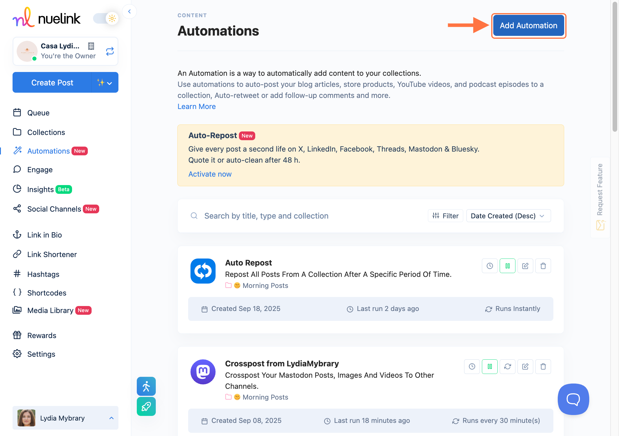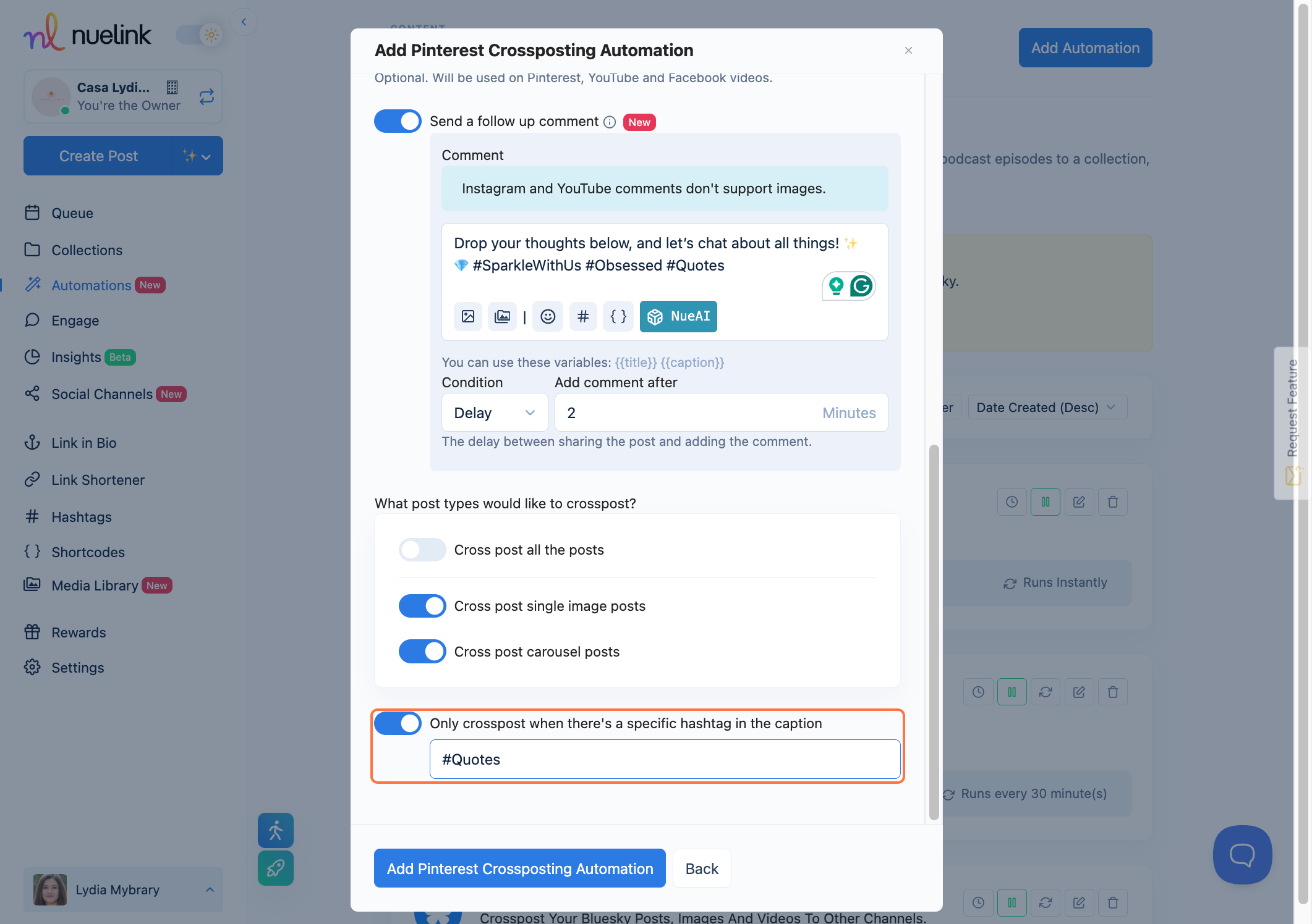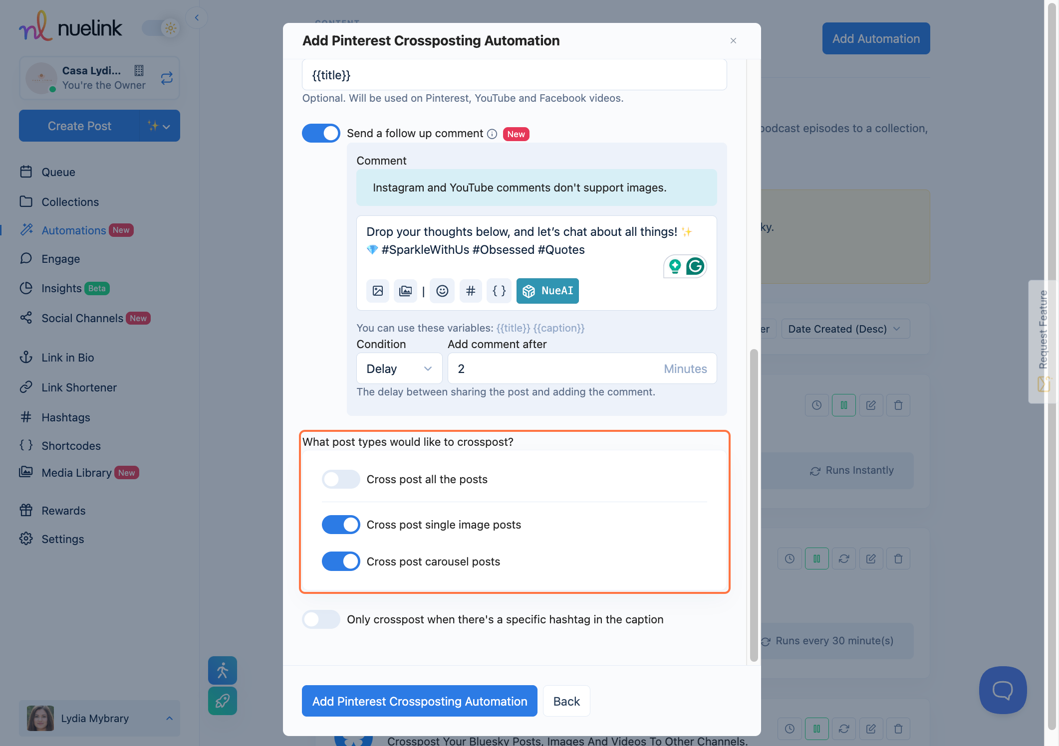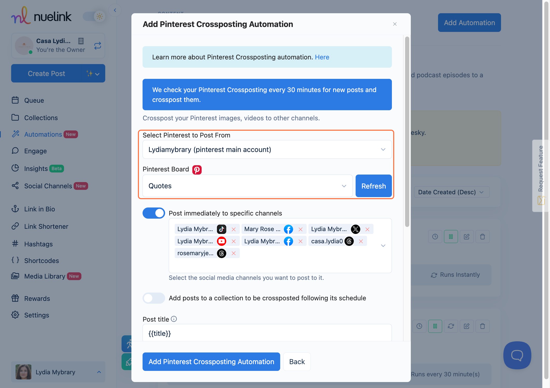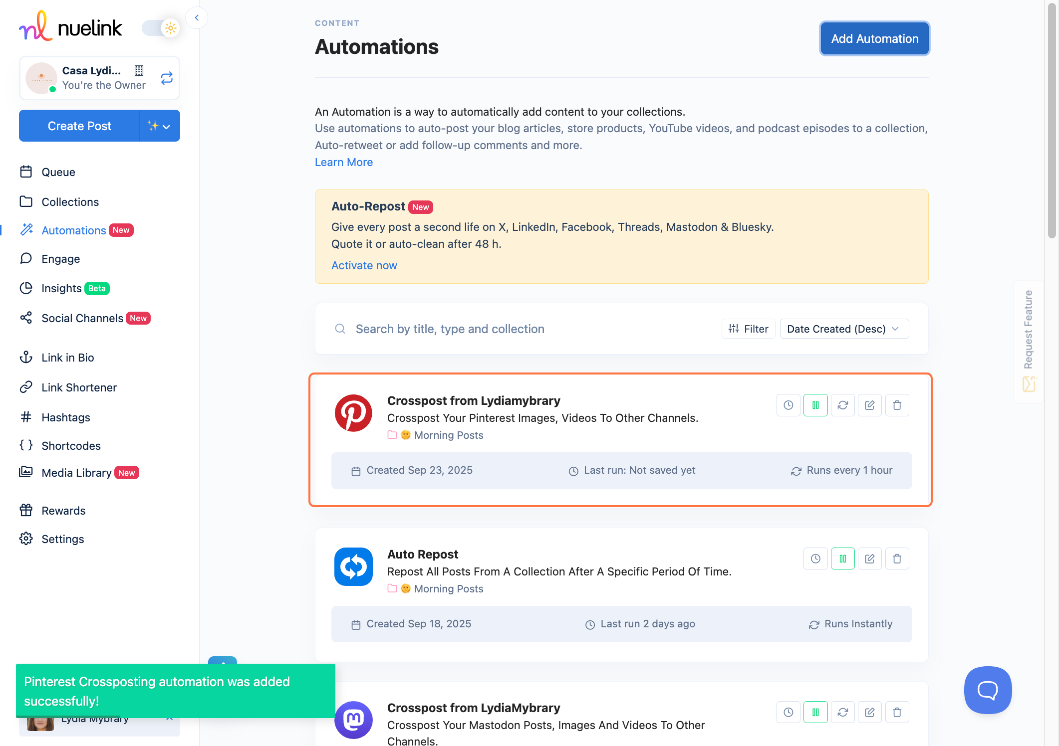 - Now, your automation is active and ready to automatically share any new content you post on your Pinterest account outside of Nuelink: