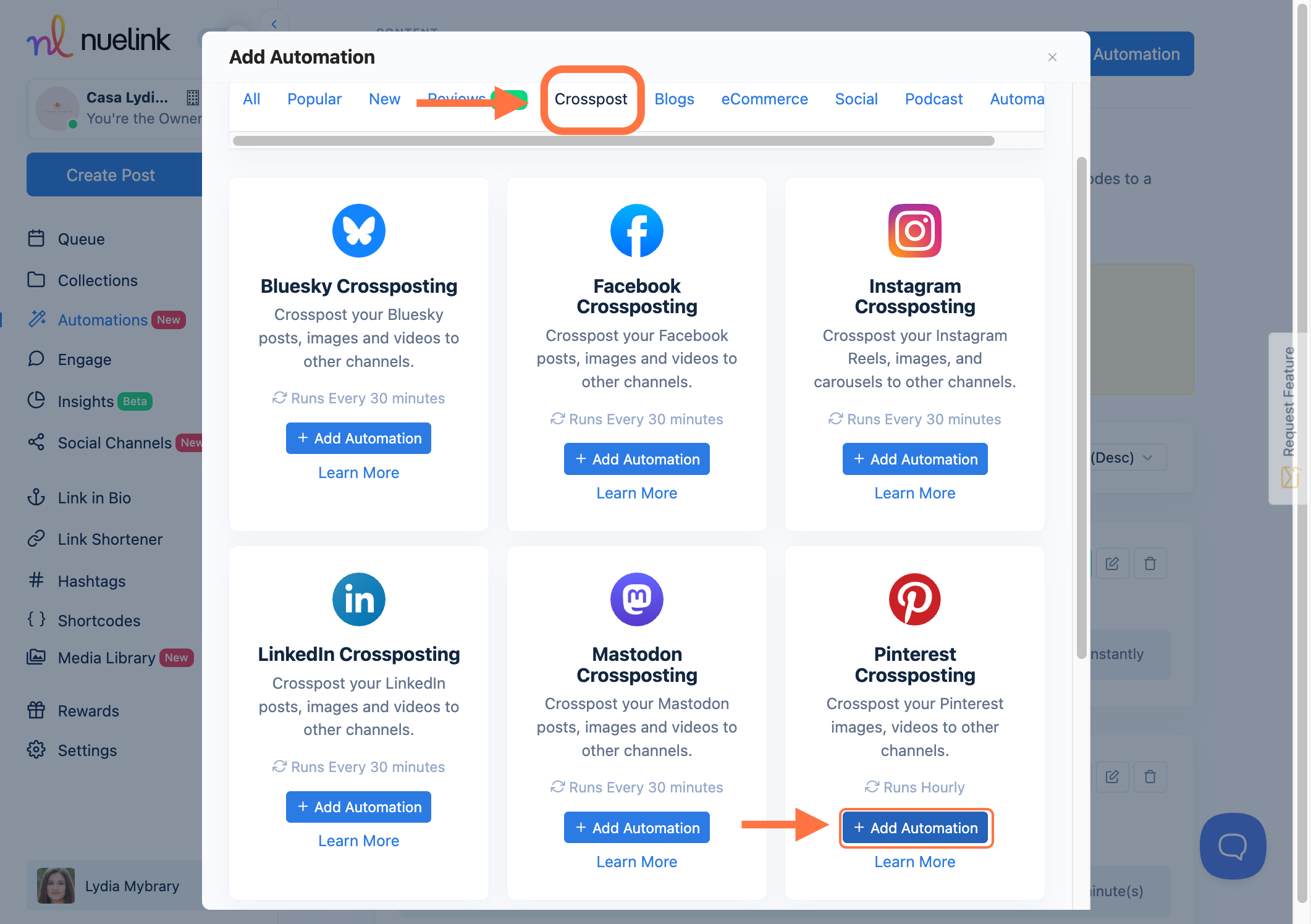 - Go to the “CrossPosting” section, and click on the “Add Automation” below the Pinterest Crossposting icon: