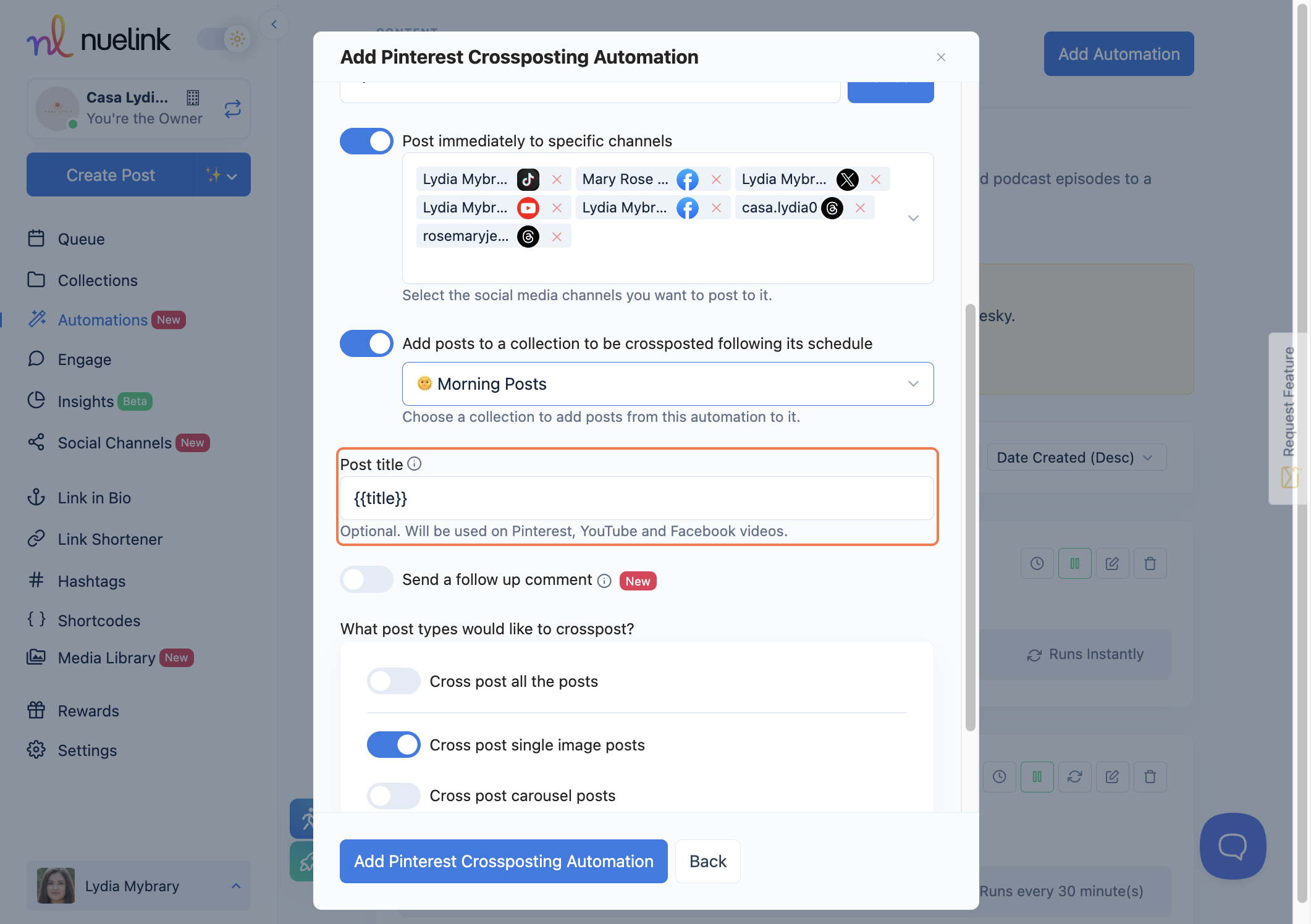 Yes. You must connect your Pinterest account and any other social accounts you want to crosspost to before setting up the automation.