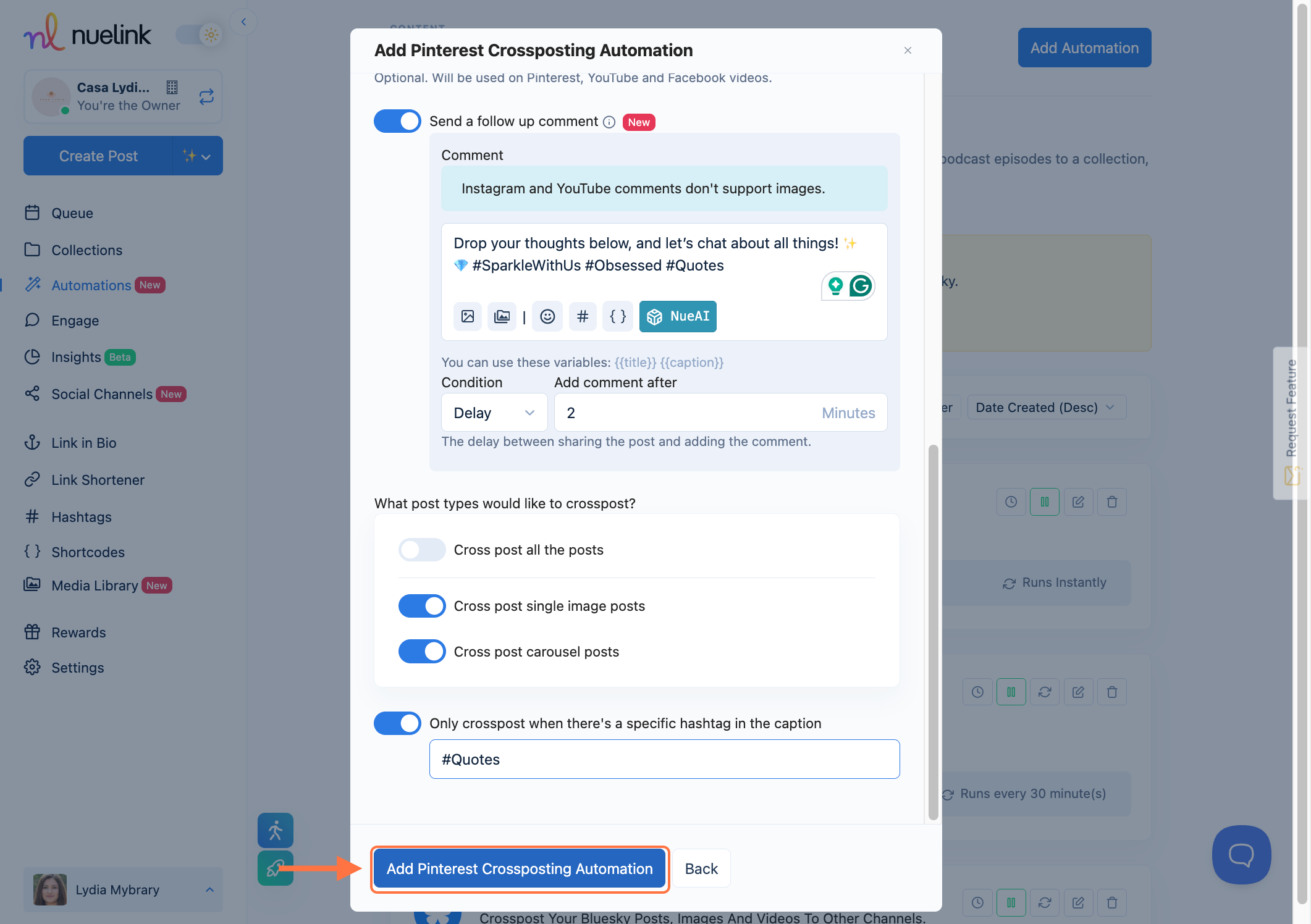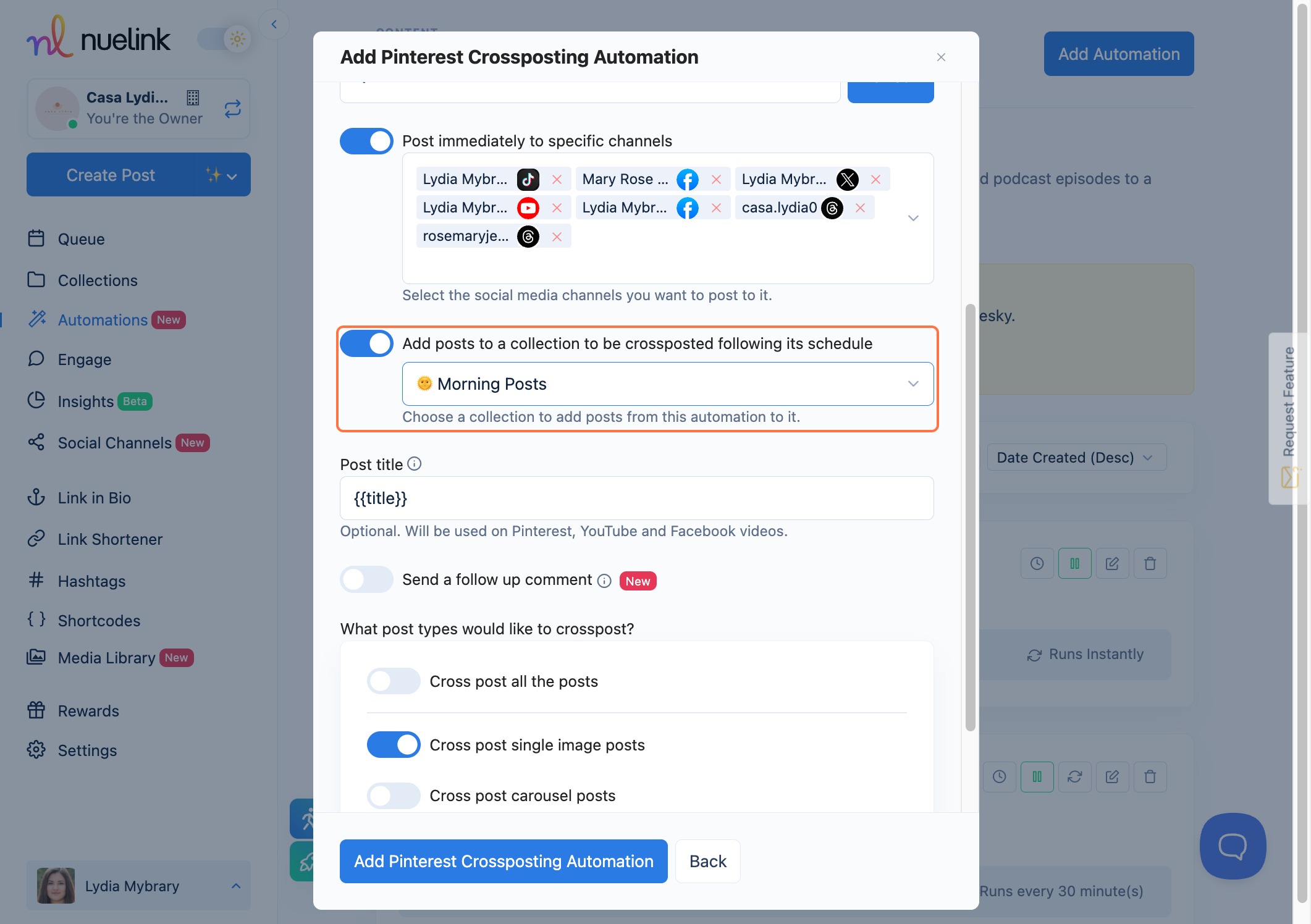 - Finish your setup by clicking on “Add Pinterest Crossposting Automation”: